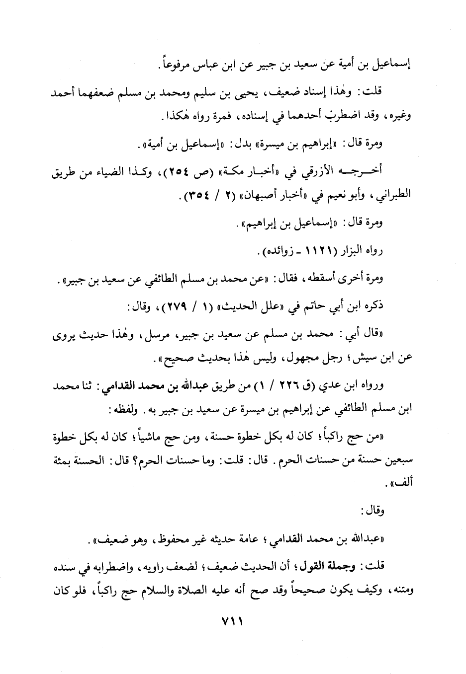 ورواه ابن عدي (ق 226 / 1) من طريق عبد الله بن محمد القدامي حدثنا محمد بن مسلم الطائفي عن إبراهيم بن ميسرة عن سعيد بن جبير به، ولفظه: " من حج راكبا كان له بكل خطوة حسنة، ومن حج ماشيا كان له بكل خطوة سبعين حسنة من حسنات الحرم، قال: قلت: وما حسنات الحرم؟ قال: الحسنة بمائة ألف " وقال: