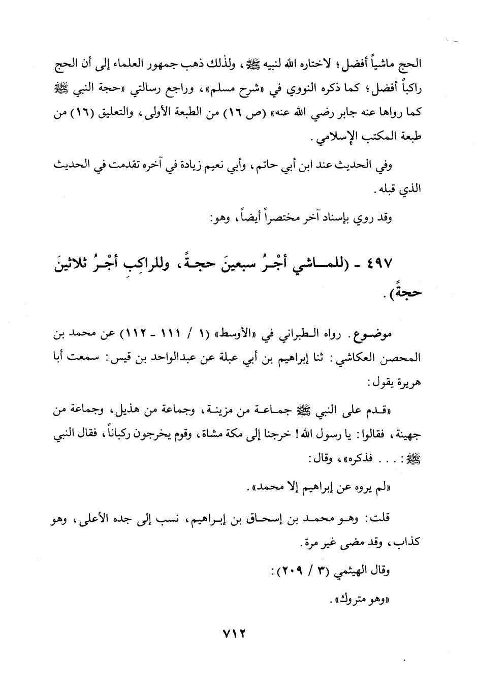 497 - " للماشي أجر سبعين حجة، وللراكب أجر ثلاثين حجة ".