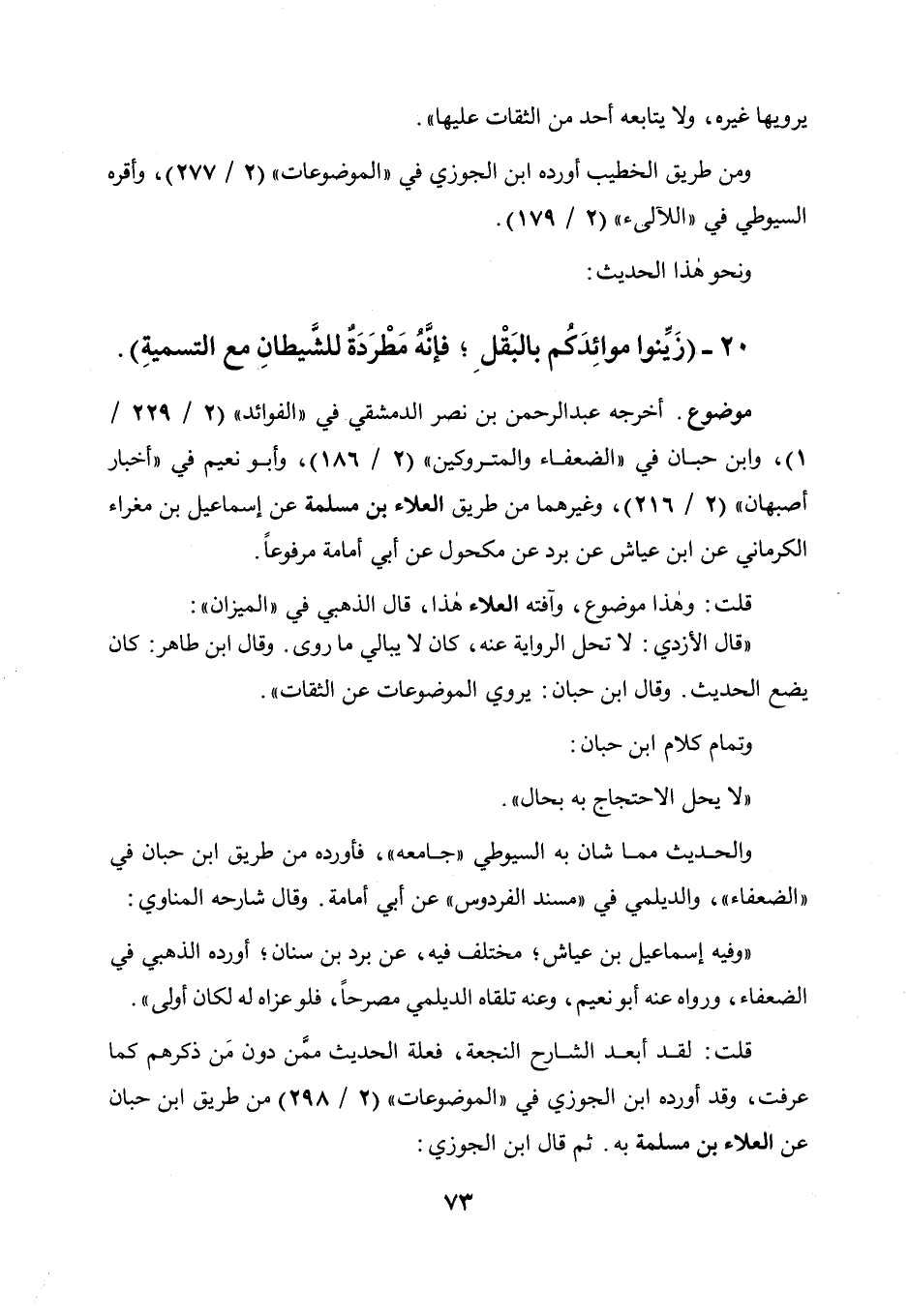 قلت: لقد أبعد الشارح النجعة فعلة الحديث ممن دون من ذكرهم كما عرفت، وقد أورده ابن الجوزي في " الموضوعات " (2 / 298) من طريق ابن حبان عن العلاء بن مسلمة به، ثم قال ابن الجوزي:
