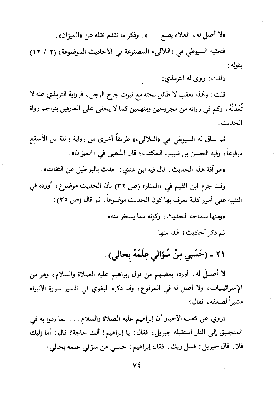 ثم ساق له السيوطي في " اللآليء " طريقا أخرى من رواية واثلة بن الأسقع مرفوعا وفيه الحسن بن شبيب المكتب، قال الذهبي في " الميزان ": هو آفة هذا الحديث قال فيه ابن عدي: حدث بالبواطيل عن الثقات وقد جزم ابن القيم في " المنار " (ص 32) بأن الحديث موضوع، أورده في التنبيه على أمور كلية يعرف بها كون الحديث موضوعا، ثم قال (ص 35) : ومنها سماجة الحديث وكونه مما يسخر منه.