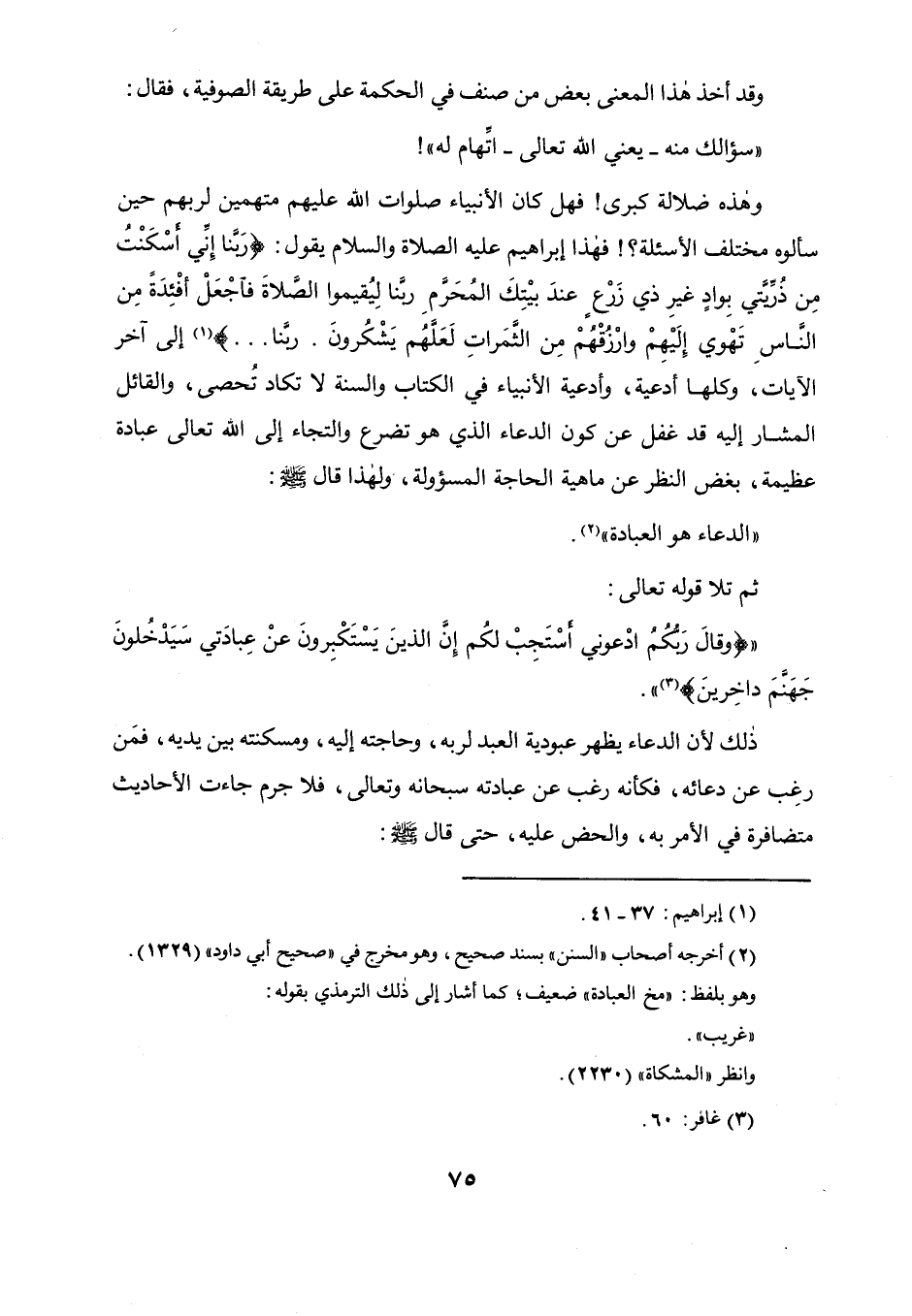 وقد أخذ هذا المعنى بعض من صنف في الحكمة على طريقة الصوفية فقال: سؤالك منه يعني الله الله تعالى اتهام له، وهذه ضلالة كبري! فهل كان الأنبياء صلوات الله عليهم متهمين لربهم حين سألوه مختلف الأسئلة؟ فهذا إبراهيم عليه الصلاة والسلام يقول: {ربنا إني أسكنت من ذريتي بواد غير ذي زرع عند بيتك المحرم، ربنا ليقيموا الصلاة فاجعل أفئدة من الناس تهو ي إليهم وارزقهم من الثمرات لعلهم يشكرون، ربنا ... ) إلى آخر الآيات وكلها أدعية، وأدعية الأنبياء في الكتاب والسنة لا تكاد تحصى، والقائل المشار إليه قد غفل عن كون الدعاء الذي هو تضرع والتجاء إلى الله تعالى عبادة عظيمة بغض النظر عن ماهية الحاجة المسؤولة، ولهذا قال صلى الله عليه وسلم: " الدعاء هو العبادة، ثم تلا قوله تعالى: {وقال ربكم ادعوني أستجب لكم إن الذين يستكبرون عن عبادتي سيدخلون جهنم داخرين} " ذلك لأن الدعاء يظهر عبودية العبد لربه وحاجته إليه ومسكنته بين يديه، فمن رغب عن دعائه، فكأنه رغب عن عبادته سبحانه وتعالى، فلا جرم جاءت الأحاديث متضافرة في الأمر به والحض عليه حتى قال صلى الله عليه وسلم: