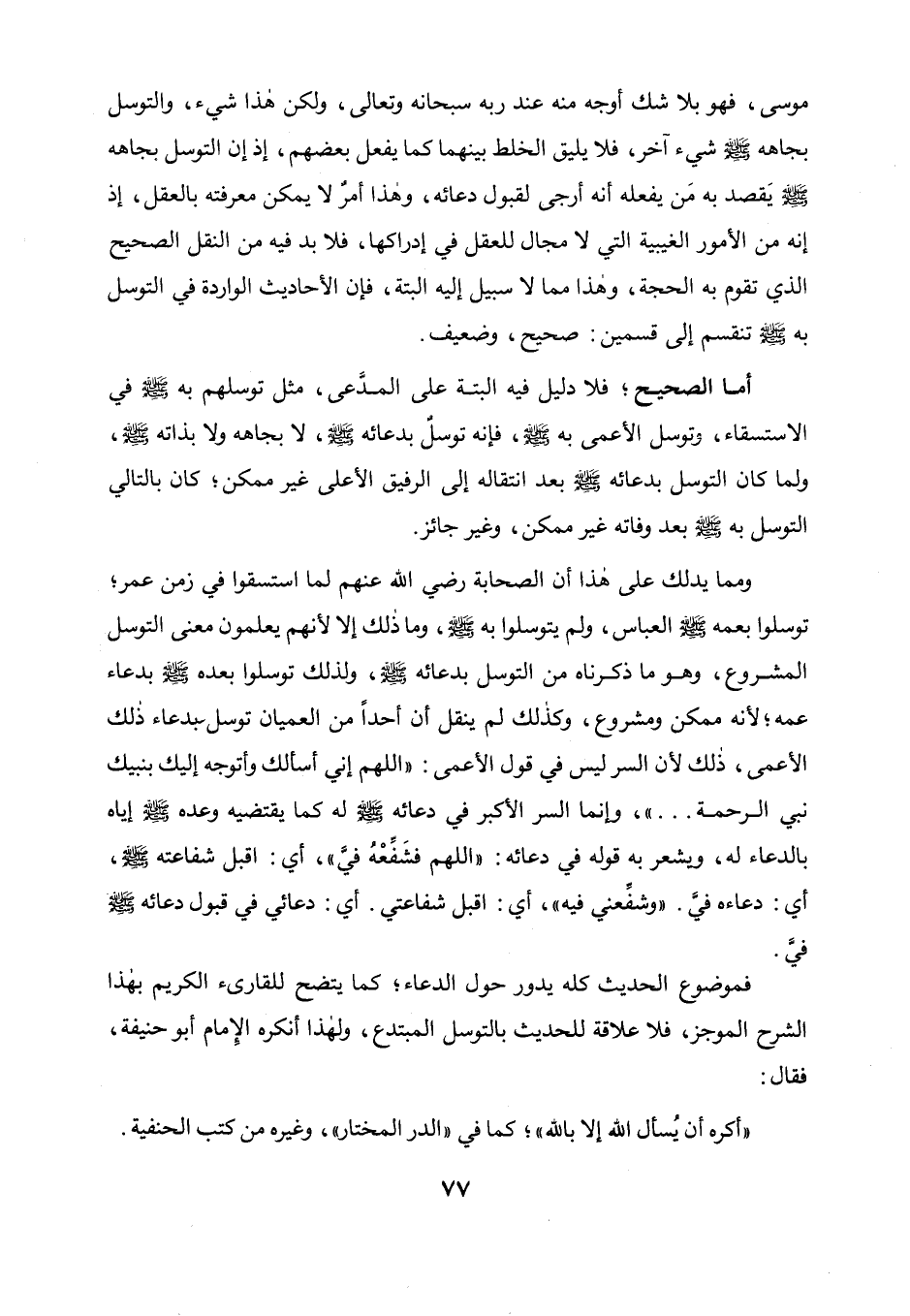 ومما يدلك على هذا أن الصحابة رضي الله عنهم لما استسقوا في زمن عمر توسلوا بعمه صلى الله عليه وسلم العباس، ولم يتوسلوا به صلى الله عليه وسلم، وما ذلك إلا لأنهم يعلمون معنى التوسل المشروع وهو ما ذكرناه من التوسل بدعائه صلى الله عليه وسلم ولذلك توسلوا بعده صلى الله عليه وسلم بدعاء عمه لأنه ممكن ومشروع، وكذلك لم ينقل أن أحدا من العميان توسل بدعاء ذلك الأعمى، ذلك لأن السر ليس في قول الأعمى: (اللهم إنى أسألك وأتوجه إليك بنبيك نبي الرحمة) .