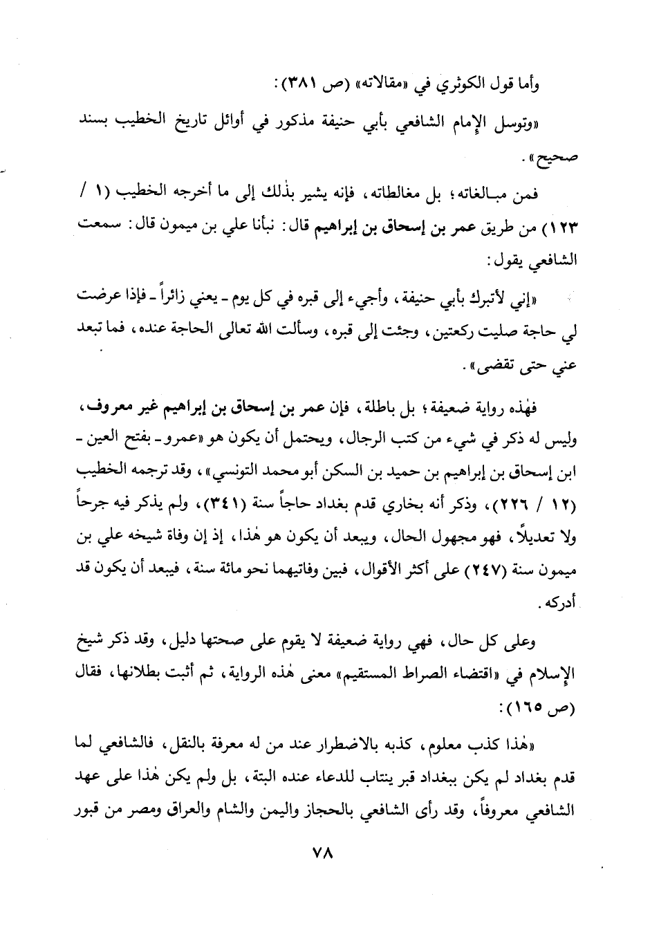 وأما قول الكوثري في مقالاته (ص 381) : وتوسل الإمام الشافعي بأبي حنيفة مذكور في أو ائل " تاريخ الخطيب " بسند صحيح فمن مبالغاته بل مغالطاته فإنه يشير بذلك إلى ما أخرجه الخطيب (1 / 123) من