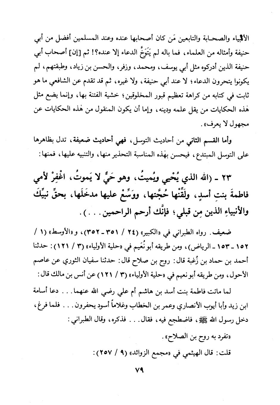 رواه الطبراني في " الكبير " (24 / 351 ـ 352) و" الأوسط " (1 / 152 ـ 153 ـ الرياض) ، ومن طريقه أبو نعيم في " حلية الأولياء " (3 / 121) : حدثنا أحمد بن حماد بن زغبة قال روح بن صلاح قال: حدثنا سفيان الثوري عن عاصم الأحول ومن طريقه أبو نعيم في " حلية الأولياء " (3 / 121) عن أنس بن مالك قال: لما ماتت فاطمة بنت أسد بن هاشم أم علي رضي الله عنهما ... دعا أسامه بن زيد وأبا أيوب الأنصاري وعمر بن الخطاب وغلاما أسود يحفرون ... فلما فرغ، دخل رسول الله صلى الله عليه وسلم فاضطجع فيه فقال ... فذكره، وقال الطبراني: تفرد به روح بن صلاح.