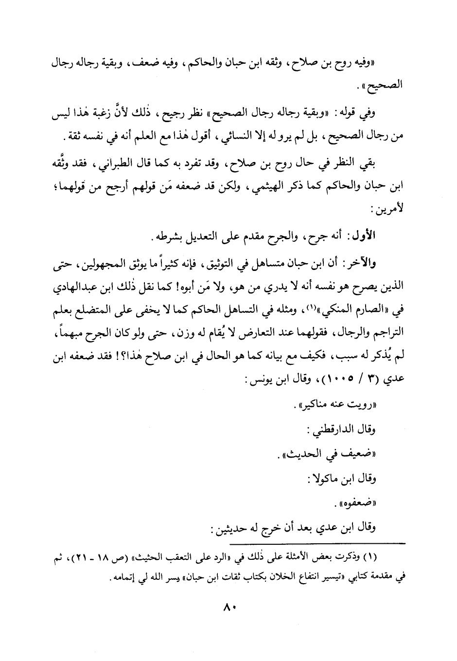 والآخر: أن ابن حبان متساهل في التوثيق فإنه كثيرا ما يوثق المجهولين حتى الذين يصرح هو نفسه أنه لا يدري من هو ولا من أبوه؟ كما نقل ذلك ابن عبد الهادي في " الصارم المنكي " ومثله في التساهل الحاكم كما لا يخفى على المتضلع بعلم التراجم والرجال فقولهما عند التعارض لا يقام له وزن حتى ولوكان الجرح مبهما لم يذكر له سبب، فكيف مع بيانه كما هو الحال في ابن صلاح هذا؟ ! فقد ضعفه ابن عدي (3 / 1005) ، وقال ابن يونس: رويت عنه مناكير، وقال الدارقطني: ضعيف في الحديث، وقال ابن ماكولا: ضعفوه، وقال ابن عدي بعد أن خرج له حديثين: