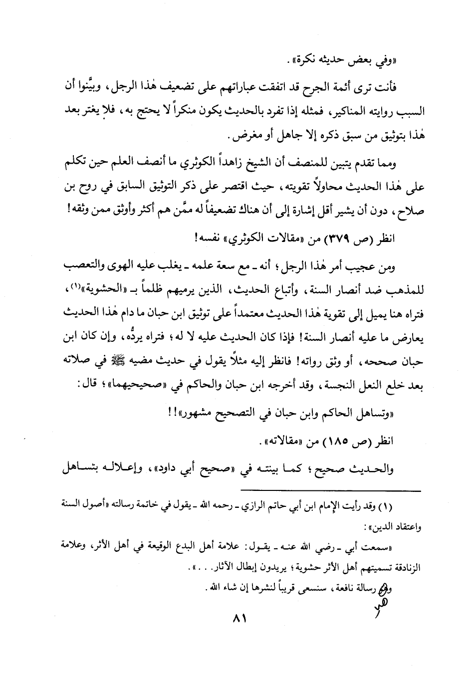 ومن عجيب أمر هذا الرجل أنه مع سعة علمه يغلب عليه الهوى والتعصب للمذهب ضد أنصار السنة وأتباع الحديث الذين يرميهم ظلما بالحشوية فتراه هنا يميل إلى تقوية هذا الحديث معتمدا على توثيق ابن حبان ما دام هذا الحديث يعارض ما عليه أنصار السنة!