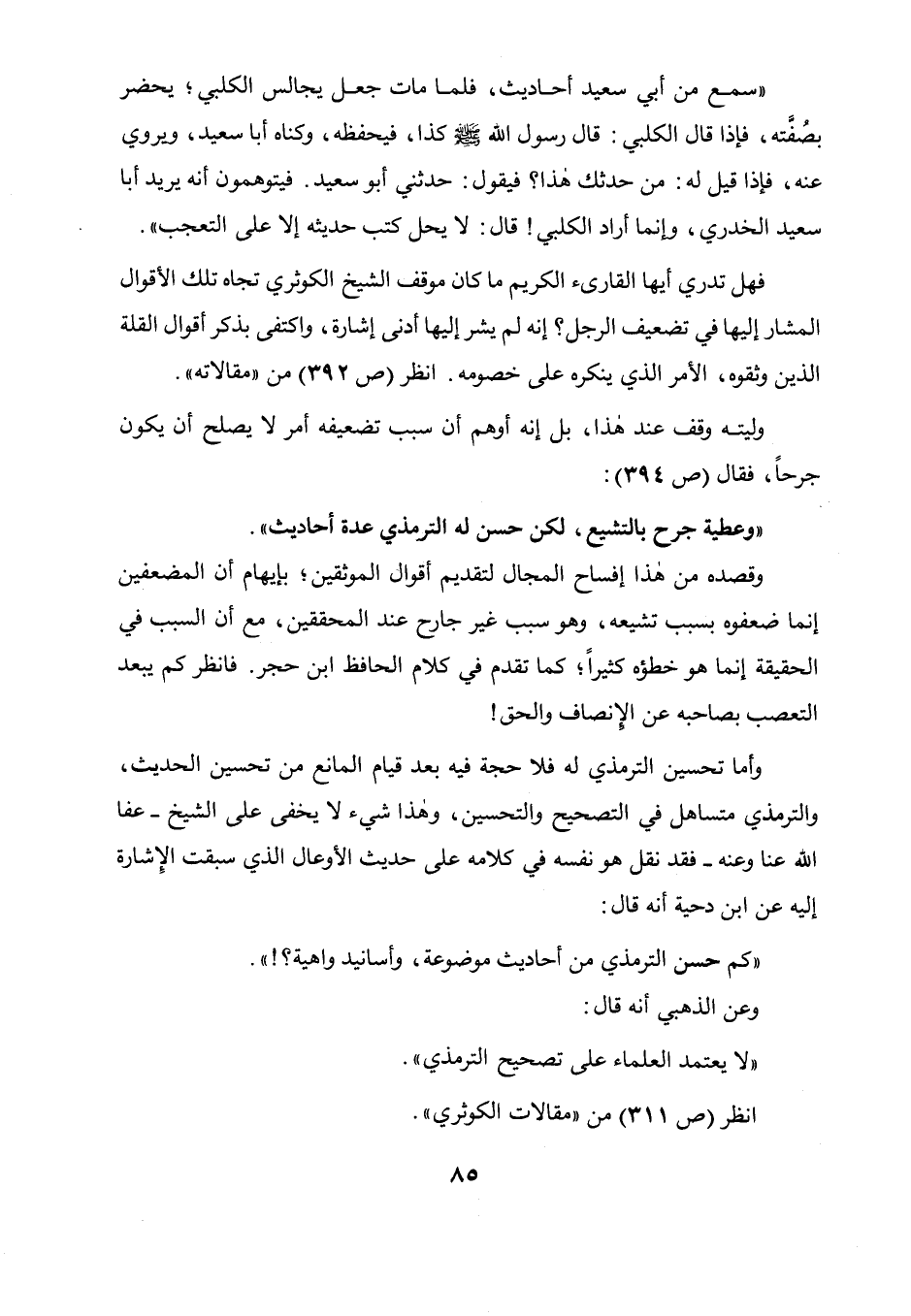 فهل تدري أيها القاريء الكريم ما كان موقف الشيخ الكوثري تجاه تلك الأقوال المشار إليها في تضعيف الرجل؟ إنه لم يشر إليها أدنى إشارة واكتفى بذكر أقوال القلة الذين وثقوه، الأمر الذي ينكره على خصومه (انظر ص 392 من " مقالاته " وليته وقف عند هذا، بل إنه أو هم أن سبب تضعيفه أمر لا يصلح أن يكون جرحا فقال (ص 394) : وعطية جرح بالتشيع، لكن حسن له الترمذي عدة أحاديث.