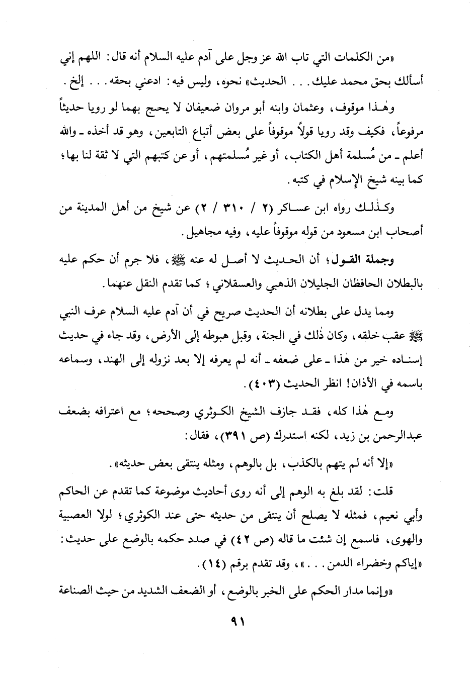 ومع هذا كله فقد جازف الشيخ الكوثري وصححه مع اعترافه بضعف عبد الرحمن بن زيد لكنه استدرك (ص 391) فقال: إلا أنه لم يتهم بالكذب، بل بالوهم، ومثله ينتقى بعض حديثه.
