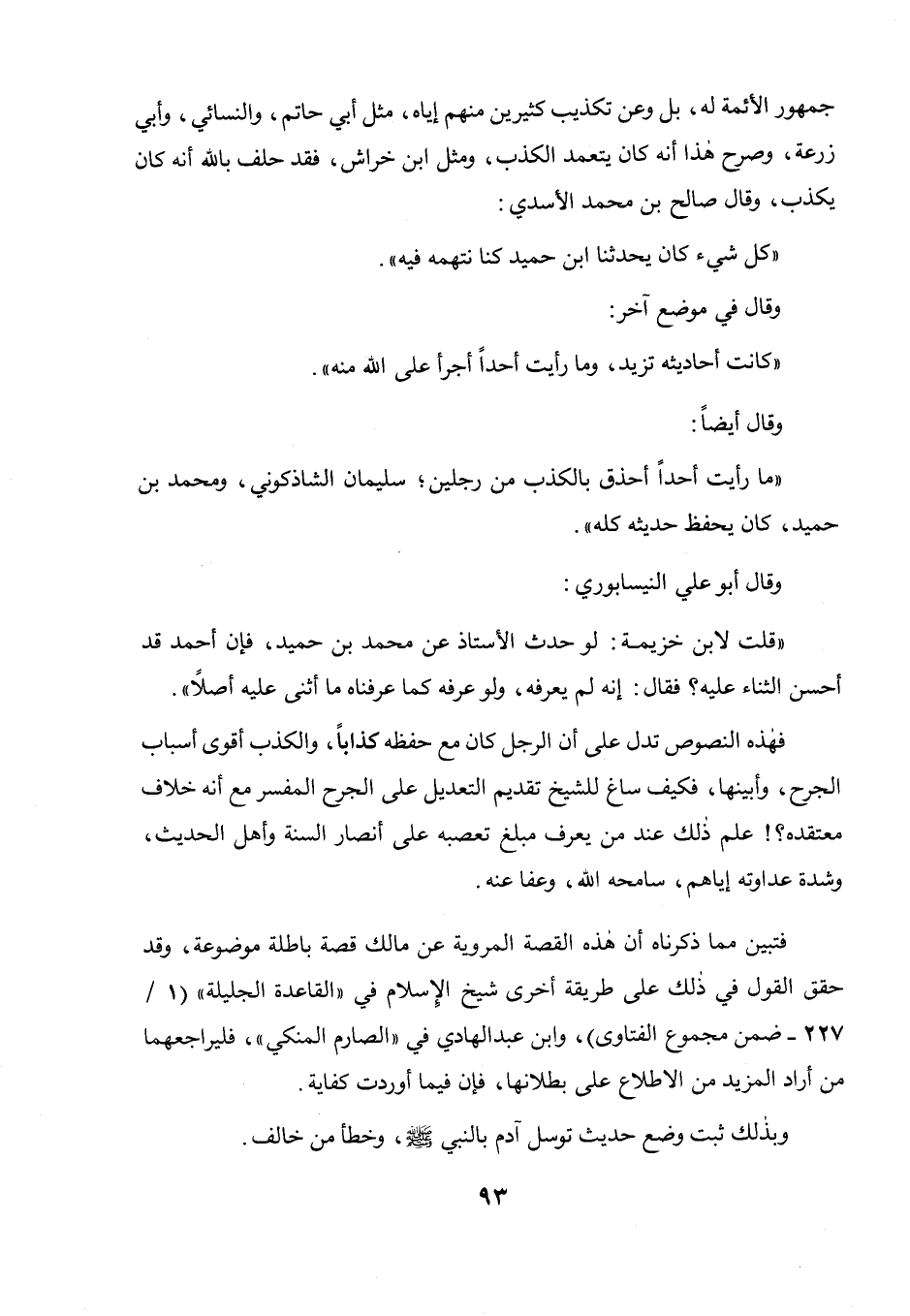 جمهو ر الأئمة له، بل وعن تكذيب كثيرين منهم إياه، مثل أبي حاتم والنسائي وأبي زرعة وصرح هذا أنه كان يتعمد الكذب، ومثل ابن خراش فقد حلف بالله أنه كان يكذب، وقال صالح بن محمد الأسدي: كل شيء كان يحدثنا ابن حميد كنا نتهمه فيه، وقال في موضع آخر: كانت أحاديثه تزيد، وما رأيت أحدا أجرأ على الله منه، وقال أيضا: ما رأيت أحدا أحذق بالكذب من رجلين سليمان الشاذكوني ومحمد ابن حميد، كان يحفظ حديثه كله.