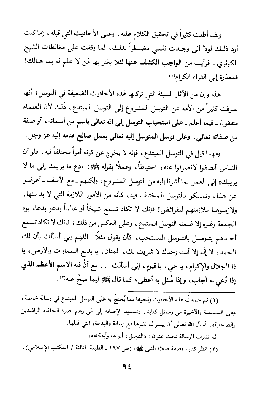 ومهما قيل في التوسل المبتدع فإنه لا يخرج عن كونه أمرا مختلفا فيه، فلو أن الناس أنصفوا لانصرفوا عنه احتياطا وعملا بقوله صلى الله عليه وسلم " دع ما يريبك إلى ما لا يريبك " إلى العمل بما أشرنا إليه من التوسل المشروع، ولكنهم مع الأسف أعرضوا عن هذا وتمسكوا بالتوسل المختلف فيه كأنه من الأمور اللازمة التي لابد منها ولازموها ملازمتهم للفرائض! فإنك لا تكاد تسمع شيخا أو عالما يدعوبدعاء يوم الجمعة وغيره إلا ضمنه التوسل المبتدع، وعلى العكس من ذلك فإنك لا تكاد تسمع أحدهم يتوسل بالتوسل المستحب كأن يقول مثلا: اللهم إنى أسألك بأن لك الحمد لا إله ألا أنت وحدك لا شريك لك المنان، يا بديع السموات والأرض، يا ذا الجلال والإكرام يا حي يا قيوم إني أسألك ... مع أن فيه الاسم الأعظم الذي إذا دعي به أجاب وإذا سئل به أعطى كما قال صلى الله عليه وسلم فيما صح عنه.