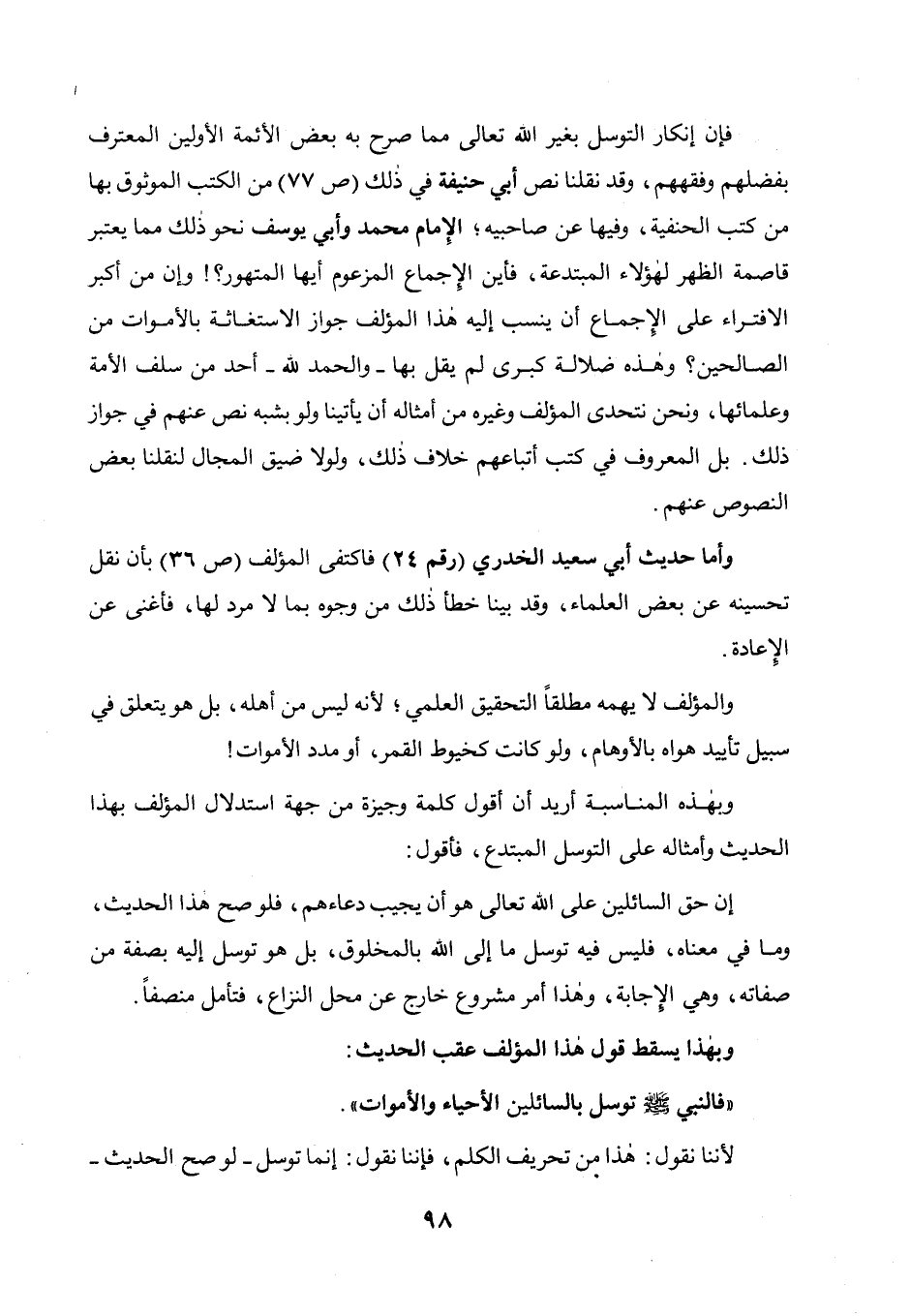 فإن إنكار التوسل بغير الله تعالى مما صرح به بعض الأئمة الأولين المعترف بفضلهم وفقههم، وقد نقلنا نص أبي حنيفة في ذلك (ص 77) من الكتب الموثوق بها من كتب الحنفية وفيها عن صاحبيه الإمام محمد وأبي يوسف نحوذلك مما يعتبر قاصمة الظهر لهؤلاء المبتدعة، فأين الإجماع المزعوم أيها المتهور؟ ! وإن من أكبر الافتراء على الإجماع أن ينسب إليه هذا المؤلف جواز الاستغاثة بالأموات من الصالحين؟ وهذه ضلالة كبري لم يقل بها - والحمد لله - أحد من سلف الأمة وعلمائها، ونحن نتحدى المؤلف وغيره من أمثاله أن يأتينا ولو بشبه نص عنهم في جواز ذلك، بل المعروف في كتب أتباعهم خلاف ذلك ولولا ضيق المجال لنقلنا بعض النصوص عنهم.