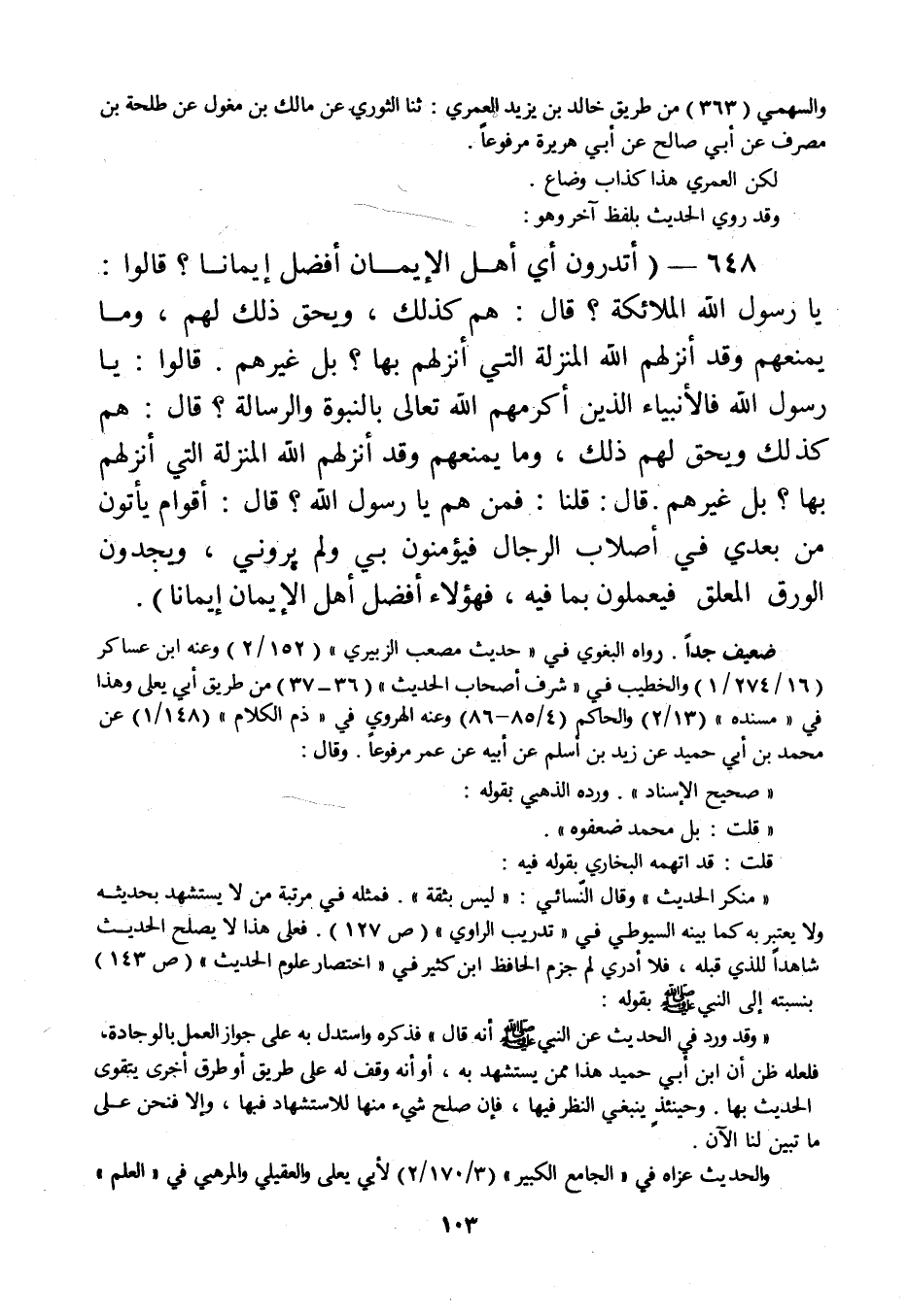 648 - " أتدرون أي أهل الإيمان أفضل إيمانا؟ قالوا: يا رسول الله الملائكة؟ قال: هم كذلك، ويحق ذلك لهم، وما يمنعهم وقد أنزلهم الله المنزلة التي أنزلهم بها؟ بل غيرهم. قالوا: يا رسول الله فالأنبياء الذين أكرمهم الله تعالى
