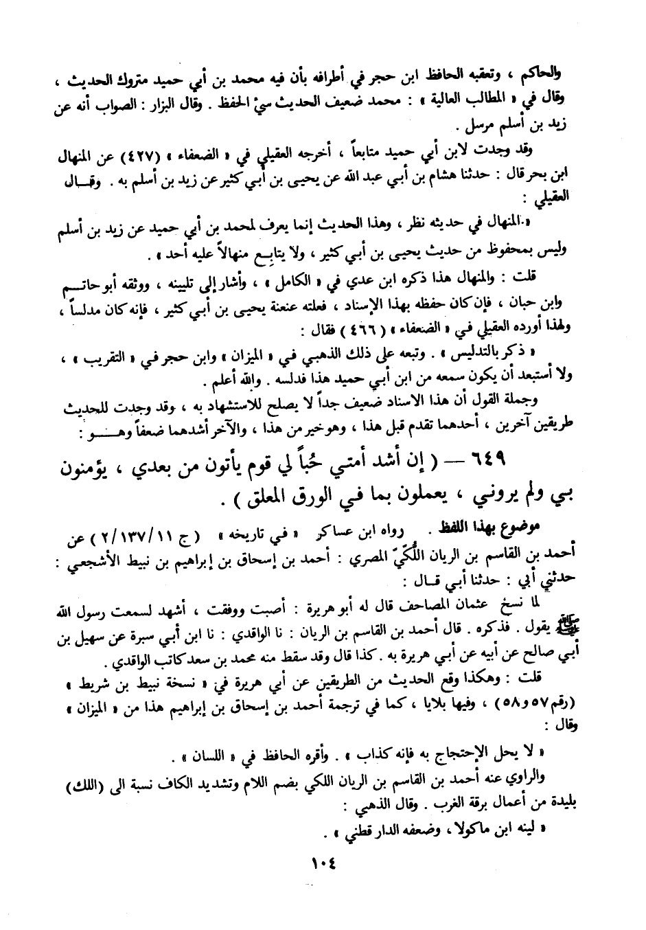 649 - إن أشد أمتي حبا لي قوم يأتون من بعدي، يؤمنون بي ولم يروني، يعملون بما في الورق المعلق ".