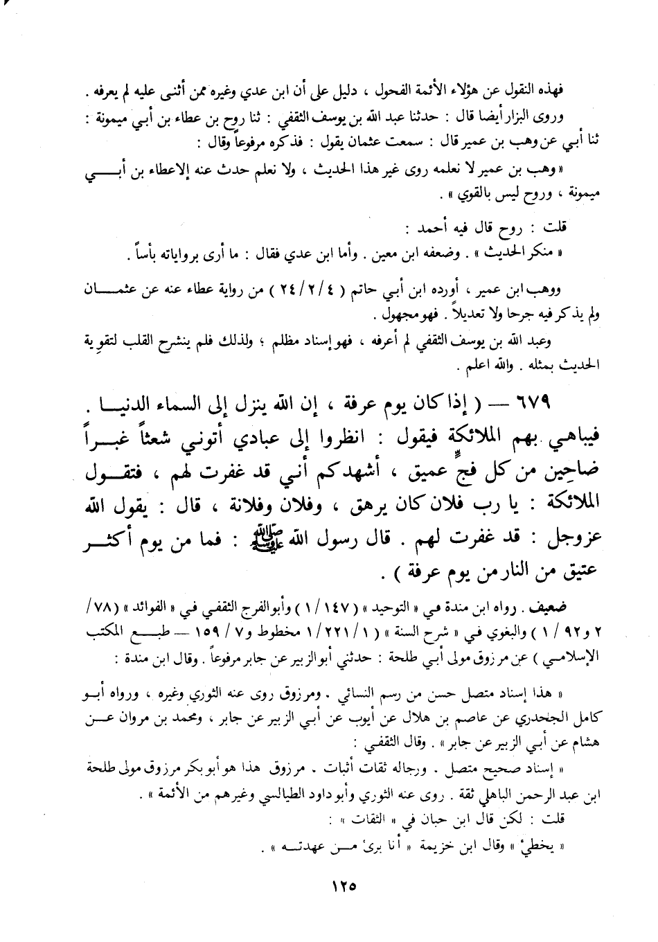 679 - " إذا كان يوم عرفة، إن الله ينزل إلى السماء الدنيا. فيباهي بهم الملائكة فيقول: انظروا إلى عبادي أتوني شعثا غبرا ضاحين من كل فج عميق، أشهدكم أني قد غفرت لهم، فتقول الملائكة: يا رب فلان كان يرهق، وفلان وفلانة، قال: يقول الله عز وجل: قد غفرت لهم. قال رسول الله صلى الله عليه وسلم: فما من يوم أكثر عتيق من النار من يوم عرفة ".