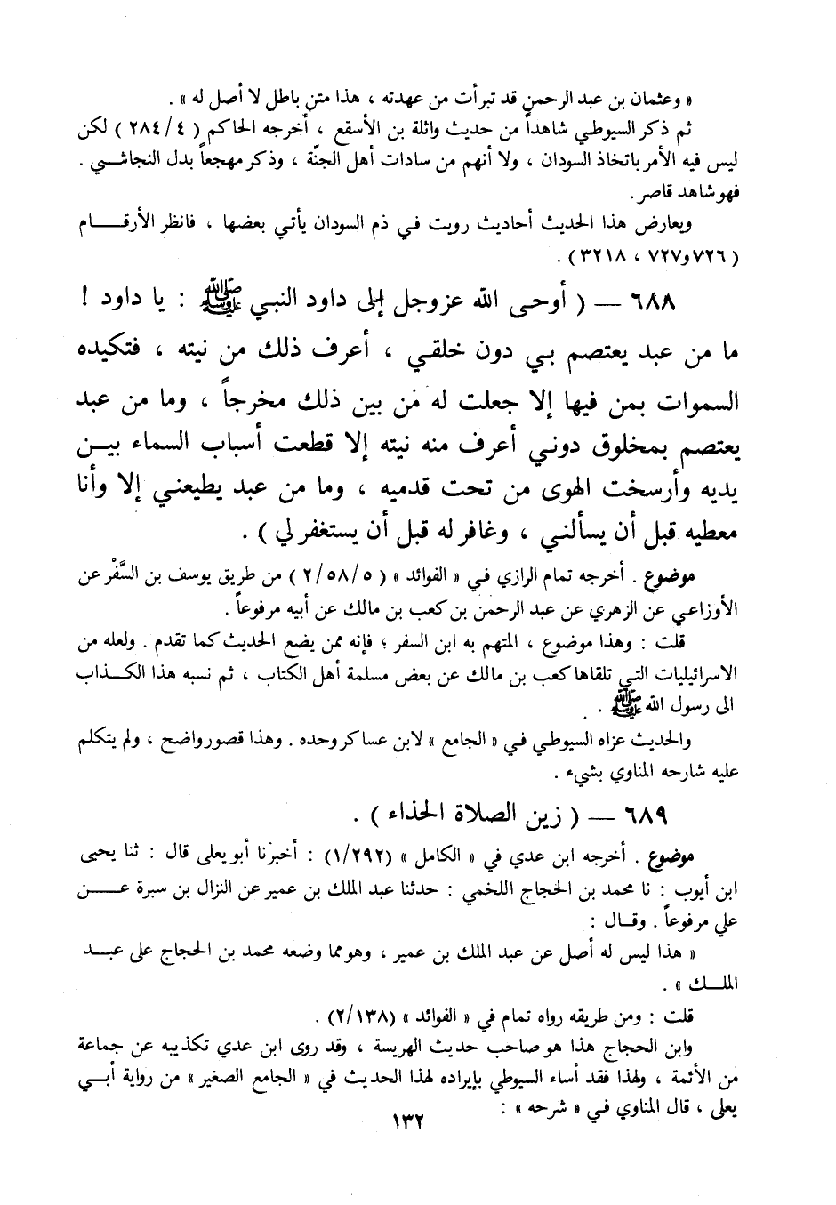 688 - " أو حى الله عز وجل إلى داود النبي صلى الله عليه وسلم: يا داود! ما من عبد يعتصم بي دون خلقي، أعرف ذلك من نيته، فتكيده السموات بمن فيها إلا جعلت له من بين ذلك مخرجا، وما من عبد يعتصم بمخلوق دوني أعرف منه نيته إلا قطعت أسباب السماء بين يديه وأرسخت الهوى من تحت قدميه، وما من عبد يطيعني إلا وأنا معطيه قبل أن يسألني، وغافر له قبل أن يستغفرني ".