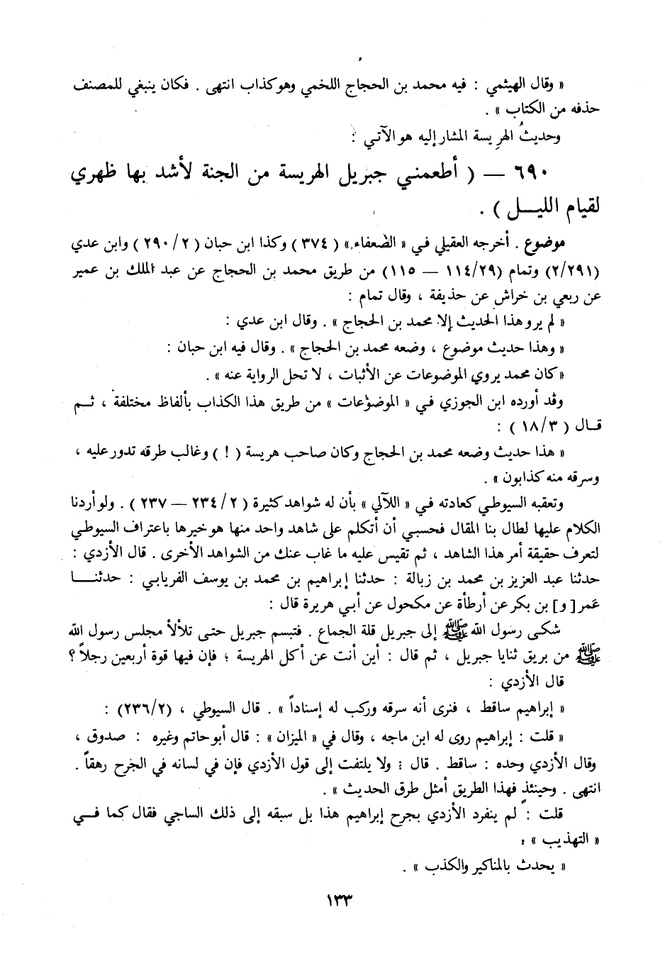 فتبسم جبريل حتى تلألأ مجلس رسول الله صلى الله عليه وسلم من بريق ثنايا جبريل، ثم قال: أين أنت عن أكل الهريسة فإن فيها قوة أربعين رجلا؟ قال الأزدي: " إبراهيم ساقط، فنرى أنه سرقه وركب له إسنادا ".