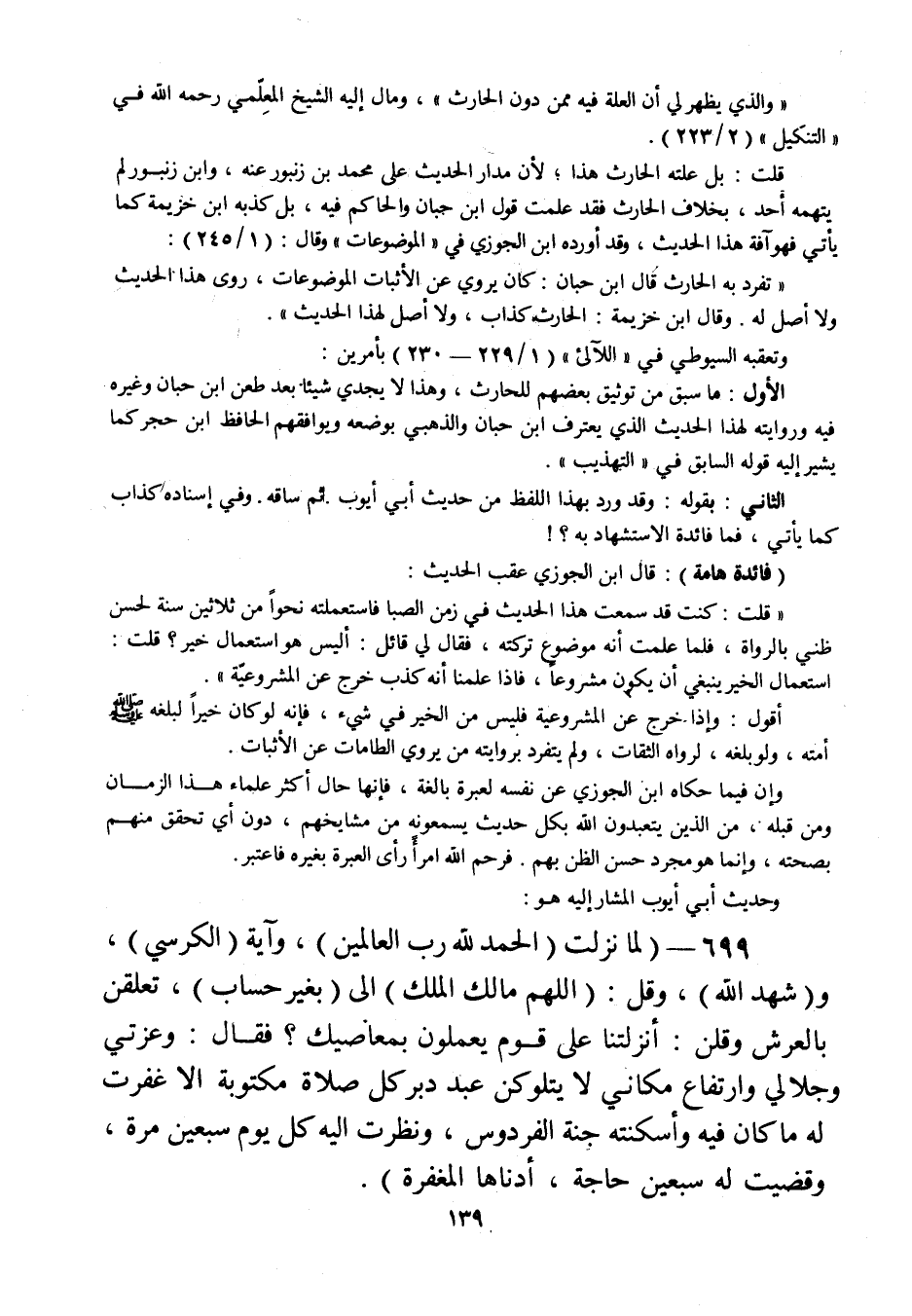 وقال ابن خزيمة: الحارث كذاب، ولا أصل لهذا الحديث ". وتعقبه السيوطي في " اللآليء " (1 / 229 - 230) بأمرين: الأول: ما سبق من توثيق بعضهم للحارث، وهذا لا يجدي شيئا بعد طعن ابن حبان وغيره فيه وروايته لهذا الحديث الذي يعترف ابن حبان والذهبي بوضعه ويوافقهم الحافظ ابن حجر كما يشير إليه قوله السابق في " التهذيب ". الثاني: بقوله: وقد ورد بهذا اللفظ من حديث أبي أيوب. ثم ساقه. وفي إسناده كذاب كما يأتي، فما فائدة الاستشهاد به؟! (فائدة هامة) : قال ابن الجوزي عقب الحديث: " قلت: كنت قد سمعت هذا الحديث في زمن الصبا فاستعملته نحوا من ثلاثين سنة لحسن ظني بالرواة، فلما علمت أنه موضوع تركته، فقال لي قائل: أليس هو استعمال خير؟ قلت: استعمال الخير ينبغي أن يكون مشروعا، فإذا علمنا أنه كذب خرج عن المشروعية ". أقول: وإذا خرج عن المشروعية فليس من الخير في شيء، فإنه لوكان خيرا لبلغه صلى الله عليه وسلم أمته، ولوبلغه، لرواه الثقات، ولم يتفرد بروايته من يروي الطامات عن الأثبات. وإن فيما حكاه ابن الجوزي عن نفسه لعبرة بالغة، فإنها حال أكثر علماء هذا الزمان ومن قبله، من الذين يتعبدون الله بكل حديث يسمعونه من مشايخهم، دون أي تحقق منهم بصحته، وإنما هو مجرد حسن الظن بهم. فرحم الله امرأ رأى العبرة بغيره فاعتبر. وحديث أبي أيوب المشار إليه هو: