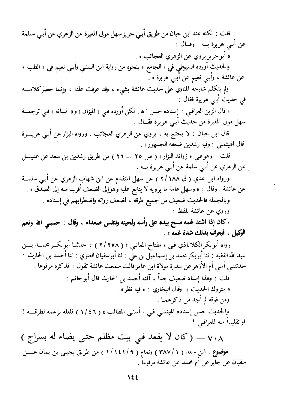 708 - " كان لا يقعد في بيت مظلم حتى يضاء له بسراج ".