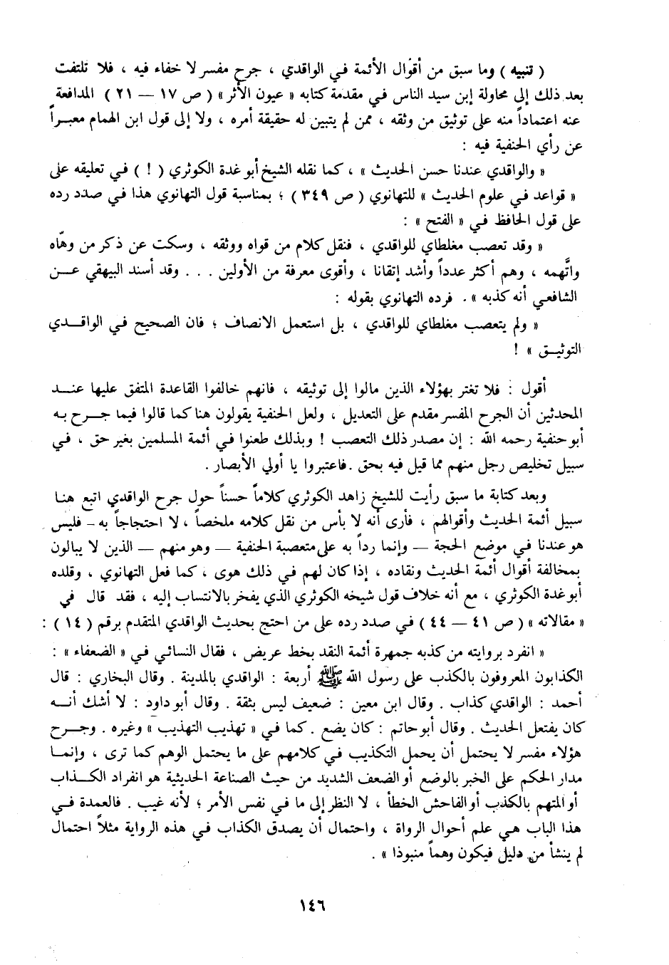 فرده التهانوي بقوله: " ولم يتعصب مغلطاي للواقدي، بل استعمل الإنصاف، فإن الصحيح في الواقدي التوثيق "! أقول: فلا تغتر بهؤلاء الذين مالوا إلى توثيقه، فإنهم خالفوا القاعدة المتفق عليها عند المحدثين أن الجرح المفسر مقدم على التعديل، ولعل الحنفية يقولون هنا كما قالوا فيما جرح به أبو حنيفة رحمه الله: