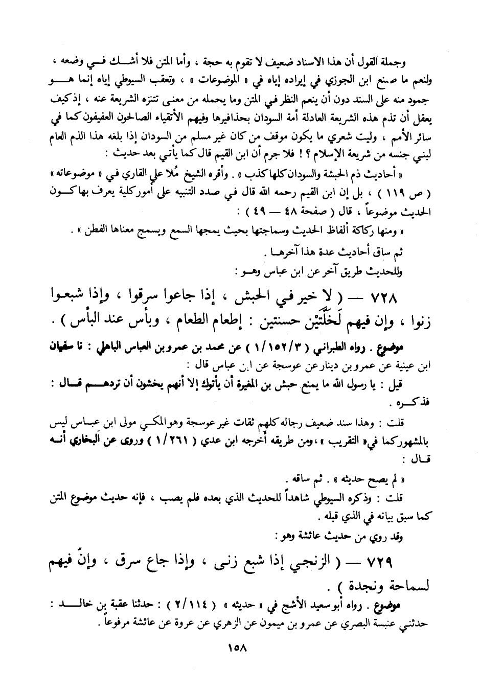 وجملة القول أن هذا الإسناد ضعيف لا تقوم به حجة، وأما المتن فلا أشك في وضعه، ولنعم ما صنع ابن الجوزي في إيراده إياه في " الموضوعات "، وتعقب السيوطي إياه إنما هو جمود منه على السند دون أن ينعم النظر في المتن وما يحمله من معنى تتنزه الشريعة عنه، إذ كيف يعقل أن تذم هذه الشريعة العادلة أمة السودان بحذافيرها وفيهم الأتقياء الصالحون العفيفون كما في سائر الأمم، وليت شعري ما يكون موقف من كان غير مسلم من السودان إذا بلغه هذا الذم العام لبني جنسه من شريعة الإسلام؟! فلا جرم أن ابن القيم قال كما يأتي بعد حديث: