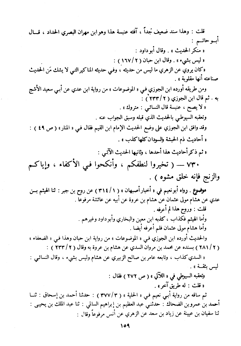 وتعقبه السيوطي بالحديث الذي قبله وسبق الجواب عنه. وقد وافق ابن الجوزي على وضع الحديث الإمام ابن القيم فقال في " المنار " (ص 49) : " أحاديث ذم الحبشة والسودان كلها كذب ". " ثم ذكر أحاديث هذا أحدها، وثانيها الحديث الآتي: "
