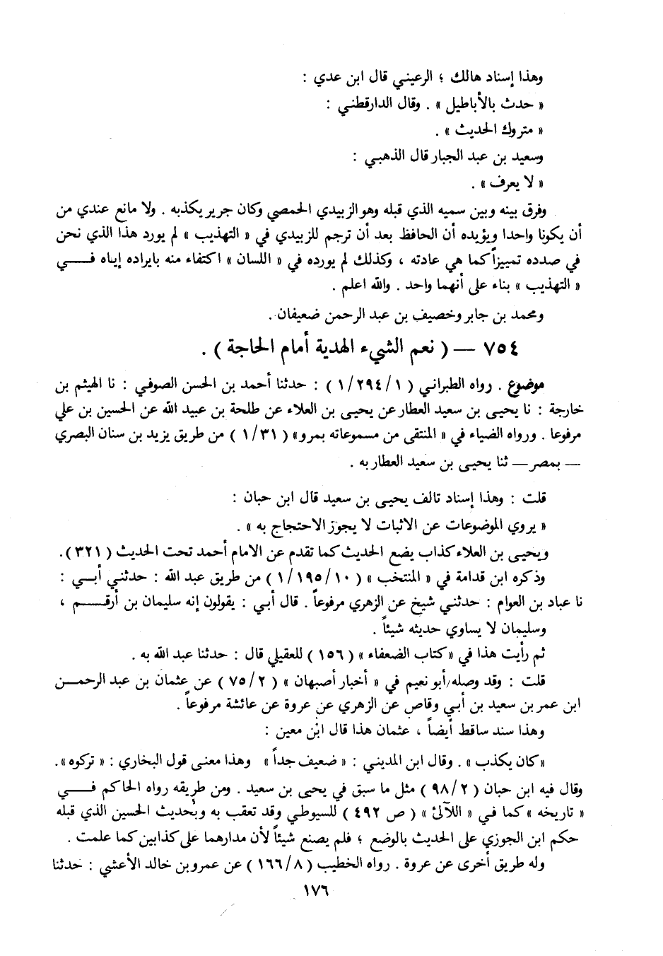 قلت: وهذا إسناد تالف يحيى بن سعيد قال ابن حبان: " يروي الموضوعات عن الأثبات لا يجوز الاحتجاج به ". ويحيى بن العلاء كذاب يضع الحديث كما تقدم عن الإمام أحمد تحت الحديث (321) .
