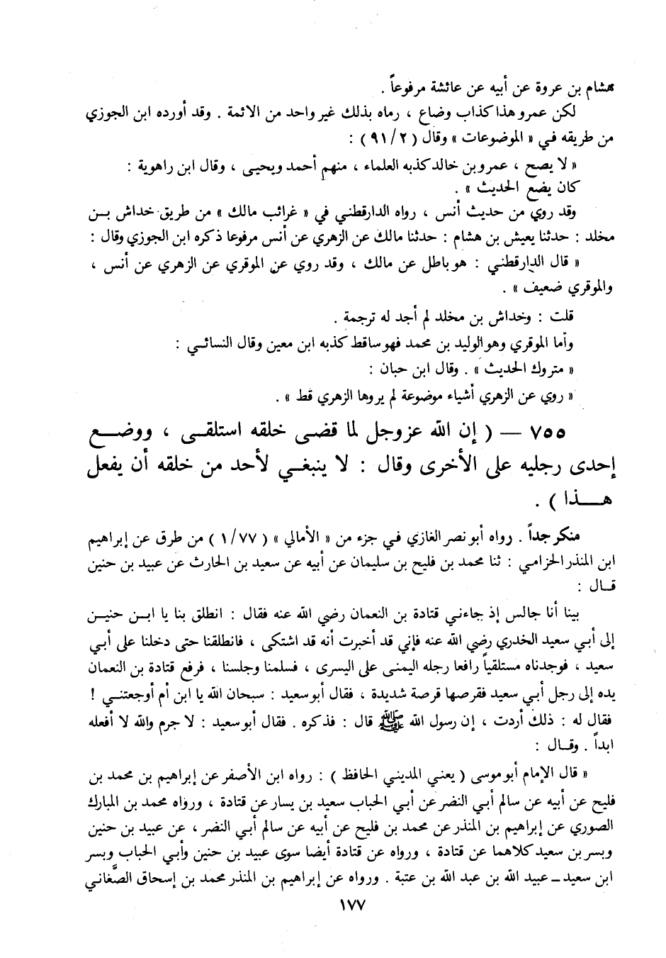 755 - " إن الله عز وجل لما قضى خلقه استلقى، ووضع إحدى رجليه على الأخرى وقال: لا ينبغي لأحد من خلقه أن يفعل هذا ".