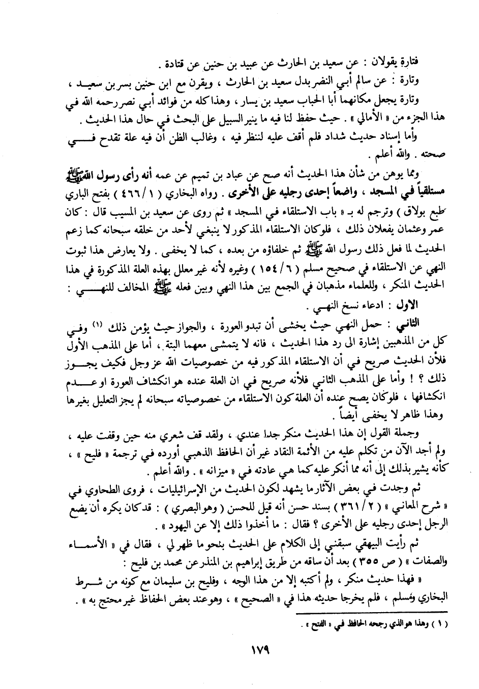 فتارة يقولان: عن سعيد بن الحارث عن عبيد بن حنين عن قتادة. وتارة: عن سالم أبي النضر بدل سعيد بن الحارث، ويقرن مع ابن حنين بسر بن سعيد وتارة يجعل مكانهما أبا الحباب سعيد بن يسار، وهذا كله من فوائد أبي نصر رحمه الله في هذا الجزء من " الأمالي ". حيث حفظ لنا فيه ما ينير السبيل على البحث في حال هذا الحديث. وأما إسناد حديث شداد فلم أقف عليه لننظر فيه، وغالب الظن أن فيه علة تقدح في صحته. والله أعلم. ومما يوهن من شأن هذا الحديث أنه صح عن عباد بن تميم عن عمه أنه رأى رسول الله عليه وسلم مستلقيا في المسجد، واضعا إحدى رجليه على الأخرى. رواه البخاري (1 / 466 بفتح الباري طبع بولاق) وترجم له بـ " باب الاستلقاء في المسجد " ثم روى عن سعيد بن المسيب قال: كان عمر وعثمان يفعلان ذلك، فلوكان الاستلقاء المذكور لا ينبغي لأحد من خلقه سبحانه كما زعم الحديث لما فعل ذلك رسول الله صلى الله عليه وسلم ثم خلفاؤه من بعده، كما لا يخفى. ولا يعارض هذا ثبوت النهي عن الاستلقاء في صحيح مسلم (6 / 154) وغيره لأنه غير معلل بهذه العلة المذكورة في هذا الحديث المنكر، وللعلماء مذهبان في الجمع بين هذا النهي وبين فعله صلى الله عليه وسلم المخالف للنهي:
