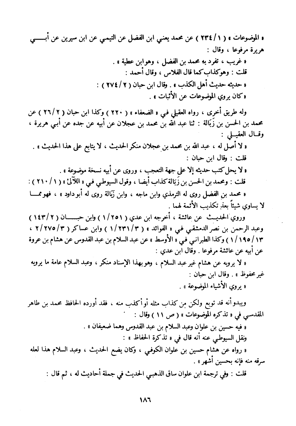 ونقل السيوطي عنه أنه قال في " تذكرة الحفاظ ": " رواه عن هشام بن حسين بن علوان الكوفي، وكان يضع الحديث، وعبد السلام هذا لعله سرقه منه فإنه بحسين أشهر ". قلت: وفيه ترجمة ابن علوان ساق الذهبي الحديث في جملة أحاديث له، ثم قال: