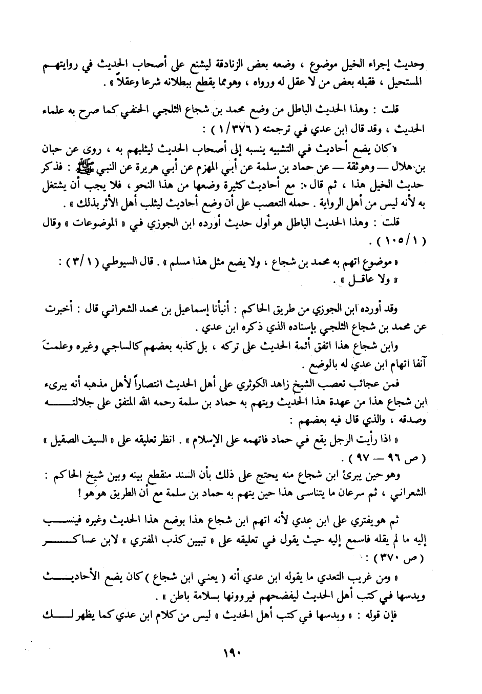 انظر تعليقه على " السيف الصقيل " (ص 96 - 97) . وهو حين يبرئ ابن شجاع منه يحتج على ذلك بأن السند منقطع بينه وبين شيخ الحاكم: الشعراني، ثم سرعان ما يتناسى هذا حين يتهم به حماد بن سلمة مع أن الطريق هو هو! ثم هو يفتري على ابن عدي لأنه اتهم ابن شجاع هذا بوضع هذا الحديث وغيره فينسب إليه ما لم يقله فاسمع إليه حيث يقول في تعليقه على " تبيين كذب المفتري " لابن عساكر (ص 370) : " ومن غريب التعدي ما يقوله ابن عدي أنه (يعني ابن شجاع) كان يضع الأحاديث ويدسها في كتب أهل الحديث ليفضحهم فيرونها بسلامة باطن ". فإن قوله: " ويدسها في كتب أهل الحديث " ليس من كلام ابن عدي كما يظهر لك