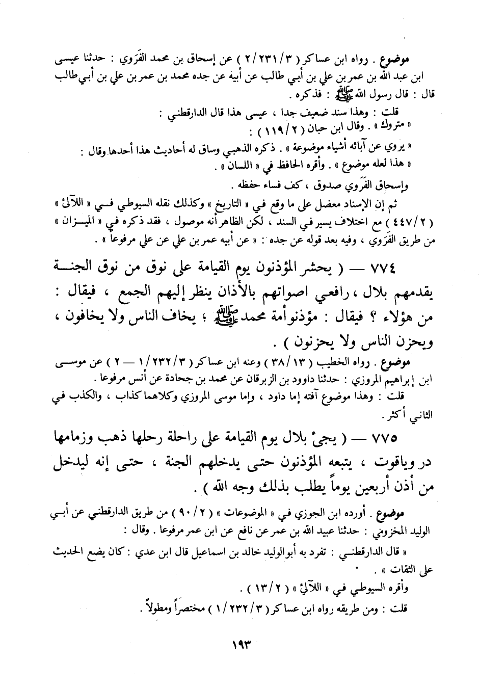 774 - " يحشر المؤذنون يوم القيامة على نوق من نوق الجنة يقدمهم بلال، رافعي أصواتهم بالأذان ينظر إليهم الجمع، فيقال: من هؤلاء؟ فيقال: مؤذنوأمة محمد صلى الله عليه وسلم، يخاف الناس ولا يخافون، ويحزن الناس ولا يحزنون ".
