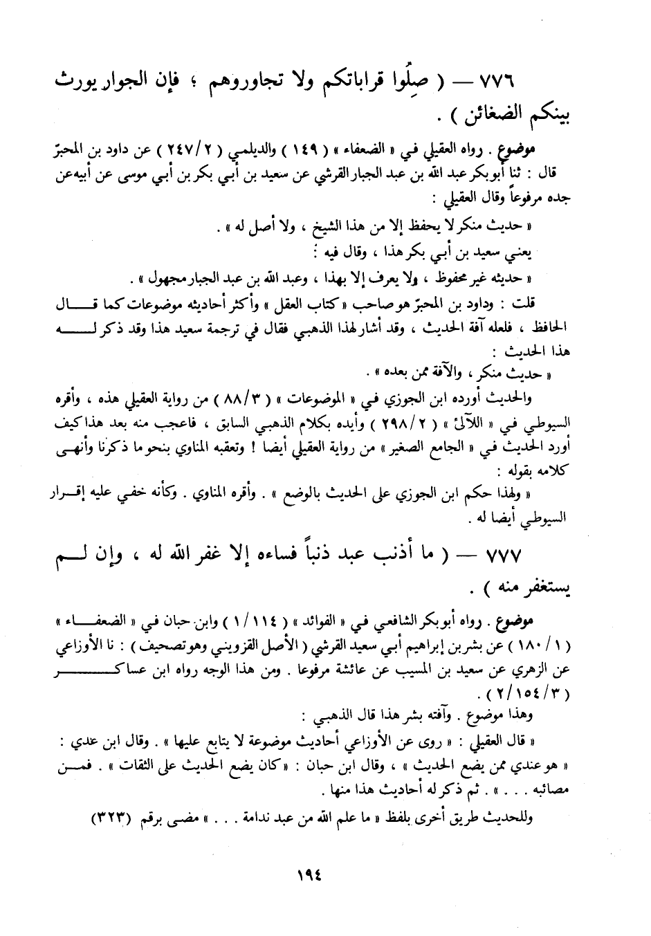 والحديث أورده ابن الجوزي في " الموضوعات " (3 / 88) من رواية العقيلي هذه، وأقره السيوطي في " اللآليء " (2 / 298) وأيده بكلام الذهبي السابق، فاعجب منه بعد هذا كيف أورد الحديث في " الجامع الصغير " من رواية العقيلي أيضا! وتعقبه المناوي بنحوما ذكرنا وأنهى كلامه بقوله: " ولهذا حكم ابن الجوزي على الحديث بالوضع ".