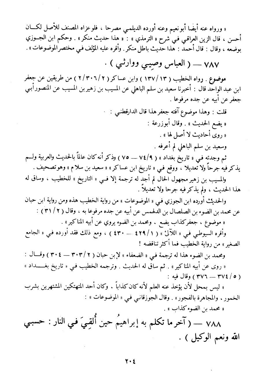 قلت: وهذا موضوع آفته جعفر هذا قال الدارقطني: " يضع الحديث ". وقال أبو زرعة: " روى أحاديث لا أصل لها ". وسعيد بن سلم الباهلي لم أعرفه. ثم وجدته في " تاريخ بغداد " (9 / 74 - 75) وذكر أنه كان عالما بالحديث والعربية ولم يذكر فيه جرحا ولا تعديلا، ووقع في " تاريخ ابن عساكر " " سعيد بن سلام " وهو تصحيف. والمسيب بن زهير مجهول الحال لم أجد له ترجمة إلا في " التاريخ " للخطيب، وساق له هذا الحديث، ولم يذكر فيه جرحا ولا تعديلا. والحديث أورده ابن الجوزي في " الموضوعات " من رواية الخطيب هذه ومن رواية ابن حبان عن محمد بن الضوء بن الصلصال بن الدلهمس عن أبيه عن جده مرفوعا به، وقال (2 / 31) : " موضوع، جعفر كذاب يضع، ومحمد بن الضوء يروي عن أبيه المناكير ". وأقره السيوطي في " اللآليء " (1 / 429 - 430) ، ومع ذلك فقد أورده في " الجامع الصغير " من رواية الخطيب فما أكثر تناقضه! ومحمد بن الضوء هذا له ترجمة في " الضعفاء " لابن حبان (2 / 303 - 304) وقال " روى عن أبيه المناكير ". ثم ساق له الحديث. وترجمه الخطيب في " تاريخ بغداد " (5 / 374 - 376) وقال فيه: " ليس بمحل لأن يؤخذ عنه العلم لأنه كان كذابا، وكان أحد المتهتكين المشتهرين بشرب الخمور، والمجاهرة بالفجور ". وقال الجوزقاني في " الموضوعات ": " محمد بن الضوء كذاب ".