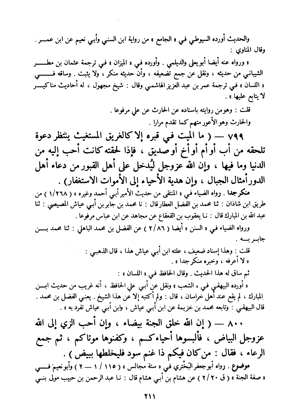 والحديث أورده السيوطي في " الجامع " من رواية ابن السني وأبي نعيم عن ابن عمر. وقال المناوي: " ورواه عنه أيضا أبو يعلى والديلمي، وأورده في " الميزان " في ترجمة عثمان بن مطر الشيباني من حديثه، ونقل عن جمع تضعيفه، وأن حديثه منكر، ولا يثبت. وساقه في " اللسان " في ترجمة عمر بن عبد العزيز الهاشمي، وقال: شيخ مجهول، له أحاديث مناكير لا يتابع عليها ".