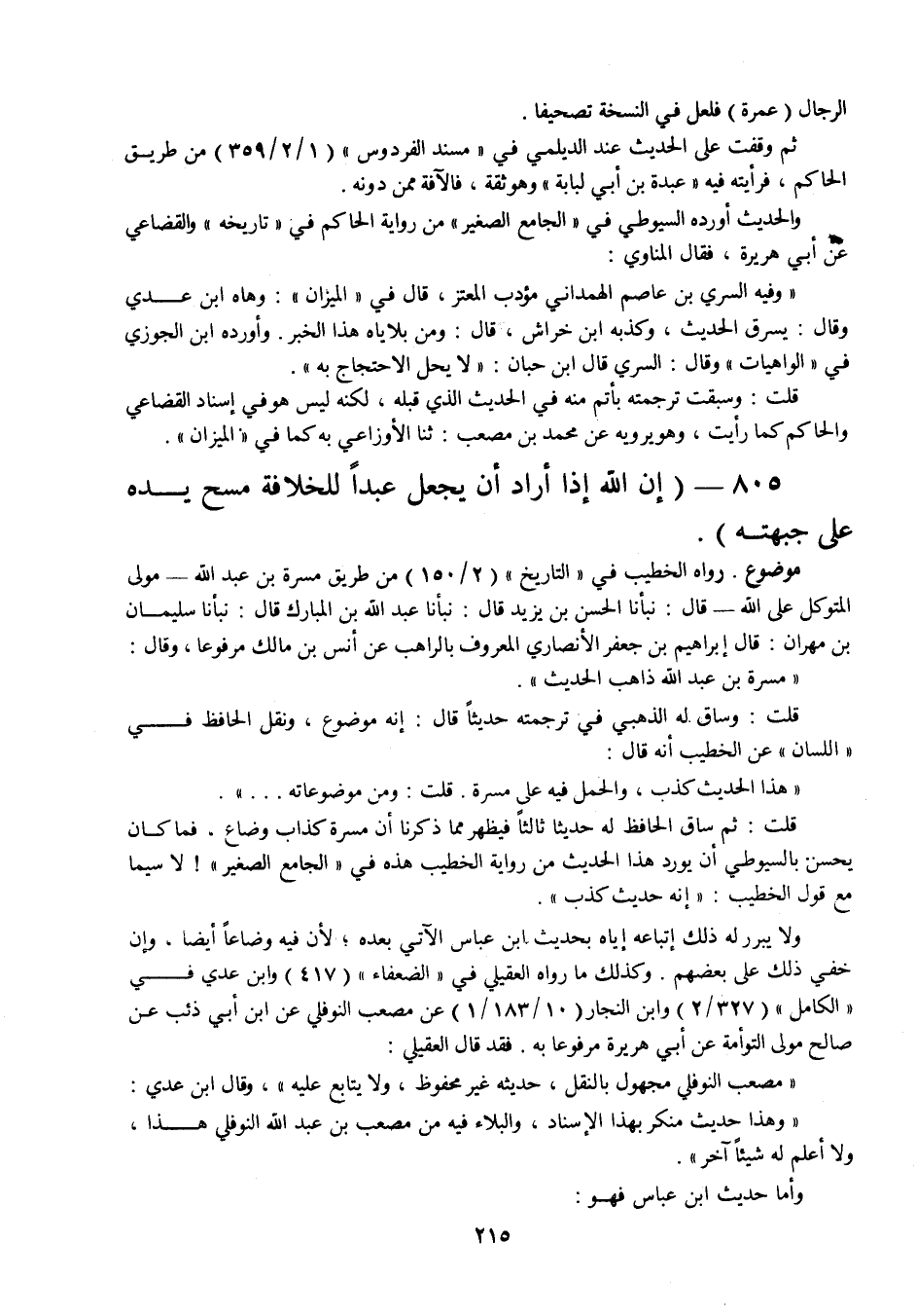 الرجال (عمرو) فلعل في النسخة تصحيفا. ثم وقفت على الحديث عند الديلمي في " مسند الفردوس " (1 / 2 / 359) من طريق الحاكم، فرأيته فيه " عبدة بن أبي لبابة " وهو ثقة، فالآفة ممن دونه. والحديث أورده السيوطي في " الجامع الصغير " من رواية الحاكم في " تاريخه " والقضاعي عن أبي هريرة، فقال المناوي: " وفيه السري بن عاصم الهمداني مؤدب المعتز، قال في " الميزان ": وهاه ابن عدي وقال: يسرق الحديث، وكذبه ابن خراش، قال: ومن بلاياه هذا الخبر، وأورده ابن الجوزي في " الواهيات " وقال: السري قال ابن حبان: " لا يحل الاحتجاج به ". قلت: وسبقت ترجمته بأتم منه في الحديث الذي قبله، لكنه ليس هو في إسناد القضاعي والحاكم كما رأيت، وهو يرويه عن محمد بن مصعب: حدثنا الأوزاعي به كما في " الميزان ".