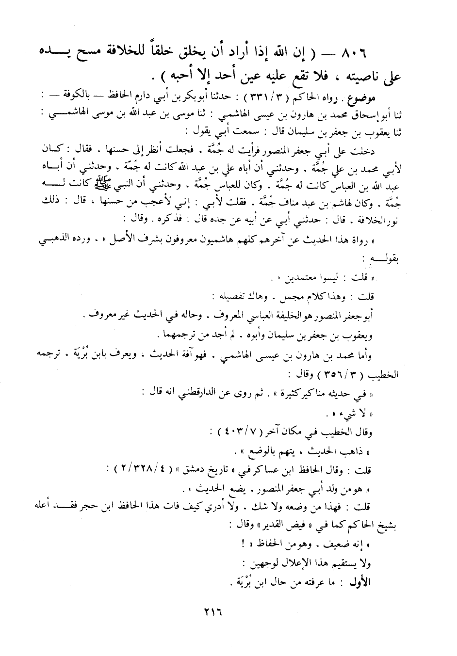وقال: " رواة هذا الحديث عن آخرهم كلهم هاشميون معروفون بشرف الأصل ". ورده الذهبي بقوله: " قلت: ليسوا معتمدين ".