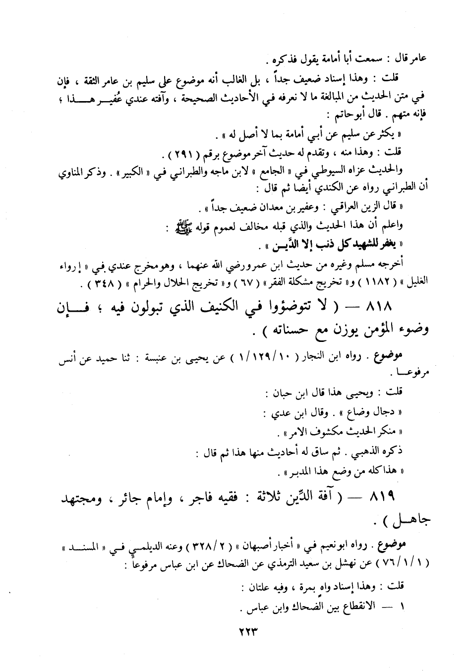 818 - " لا تتؤضؤوا في الكنيف الذي تبولون فيه، فإن وضوء المؤمن يوزن مع حسناته ".