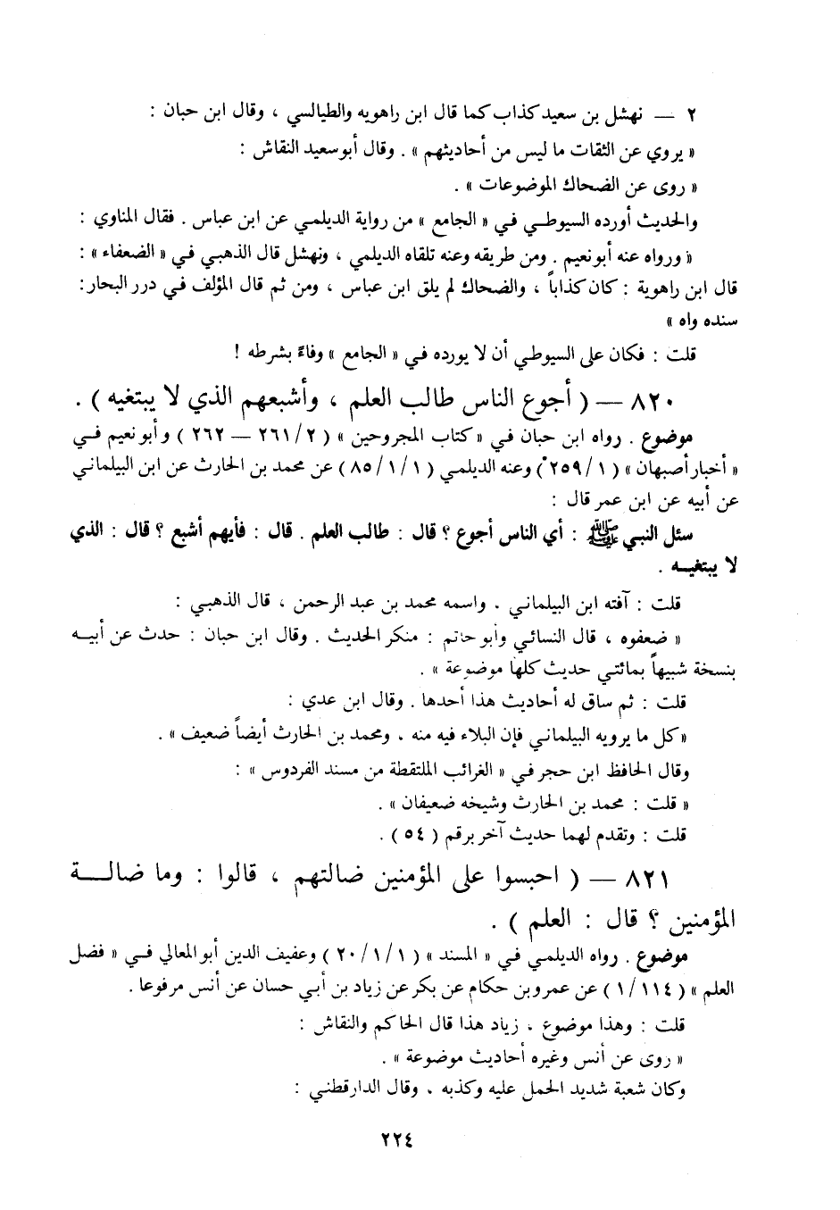 رواه ابن حبان في " كتاب المجروحين " (2 / 261 - 262) وأبو نعيم في " أخبار أصبهان " (1 / 259) وعنه الديلمي (1 / 1 / 85) عن محمد بن الحارث عن ابن البيلماني عن أبيه عن ابن عمر قال: " سئل النبي صلى الله عليه وسلم: أي الناس أجوع؟ قال: طالب العلم. قال: فأيهم أشبع؟ قال: الذي لا يبتغيه ". قلت: آفته ابن البيلماني، واسمه محمد بن عبد الرحمن، قال الذهبي: " ضعفوه، قال النسائي وأبو حاتم: منكر الحديث، وقال ابن حبان: حدث عن أبيه بنسخة شبيها بمائتين حديث كلها موضوعة ".