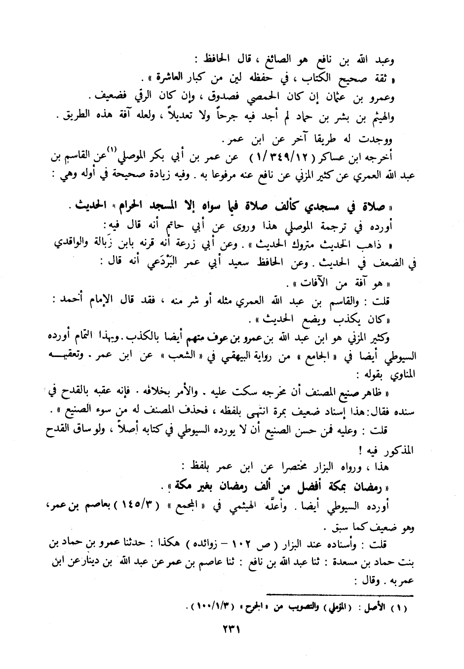 قلت: وعليه فمن حسن الصنيع أن لا يورده السيوطي في كتابه أصلا، ولوساق القدح المذكور فيه! هذا، ورواه البزار مختصرا عن ابن عمر بلفظ: " رمضان بمكة أفضل من ألف رمضان بغير مكة ". أورده السيوطي أيضا. وأعله الهيثمي في " المجمع " (3 / 145) بعاصم بن عمر، وهو ضعيف كما سبق. قلت: وإسناده عند البزار (ص 102 - زوائده) هكذا: حدثنا عمرو بن حماد بن بنت حماد بن مسعدة: حدثنا عبد الله بن نافع: حدثنا عاصم بن عمر عن عبد الله بن دينار عن ابن عمر به. وقال: