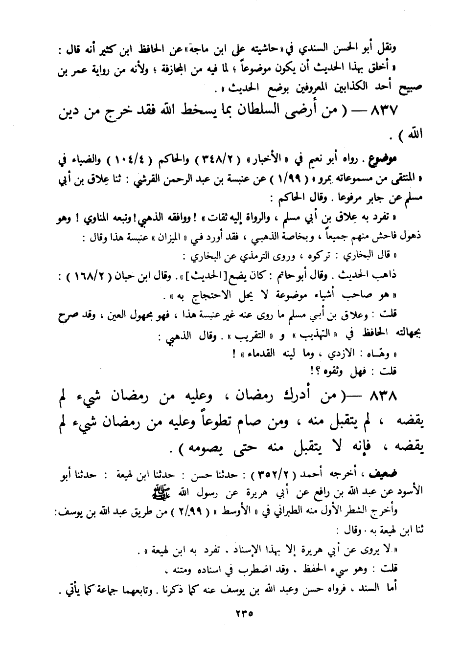 وقال أبو حاتم: كان يضع [الحديث] ". وقال ابن حبان (2 / 168) : " هو صاحب أشياء موضوعة لا يحل الاحتجاج به ". قلت: وعلاق بن أبي مسلم ما روى عنه غير عنبسة هذا، فهو مجهول العين، وقد صرح بجهالته الحافظ في " التهذيب "، و" التقريب ". وقال الذهبي: " وهاه: الأزدي، وما لينه القدماء "! قلت: