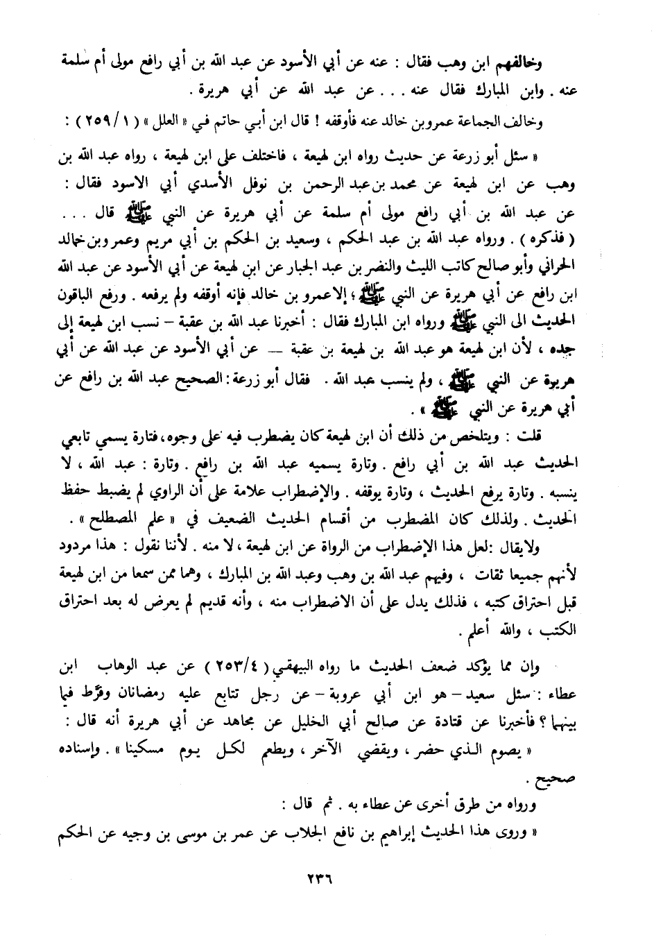 ورفع الباقون الحديث إلى النبي صلى الله عليه وسلم ورواه ابن المبارك فقال: أخبرنا عبد الله بن عقبة - نسب ابن لهيعة إلى جده، لأن ابن لهيعة هو عبد الله بن لهيعة بن عقبة - عن أبي الأسود عن عبد الله عن أبي هريرة عن النبي صلى الله عليه وسلم، ولم ينسب عبد الله. فقال أبو زرعة: الصحيح عبد الله بن رافع عن أبي هريرة عن النبي صلى الله عليه وسلم ".