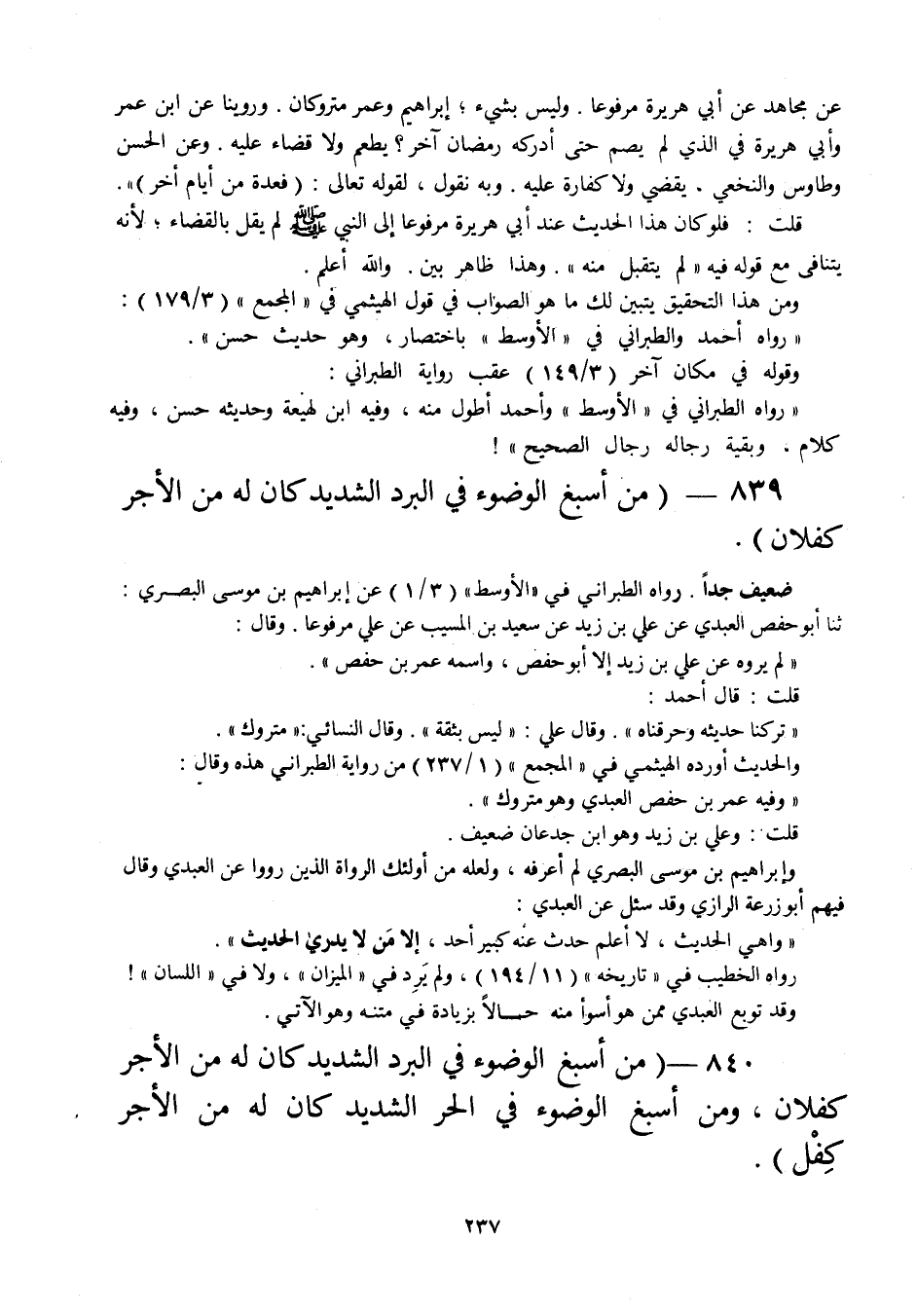 840 - " من أسبغ الوضوء في البرد الشديد كان له من الأجر كفلان، ومن أسبغ الوضوء في الحر الشديد كان له من الأجر كفل ".