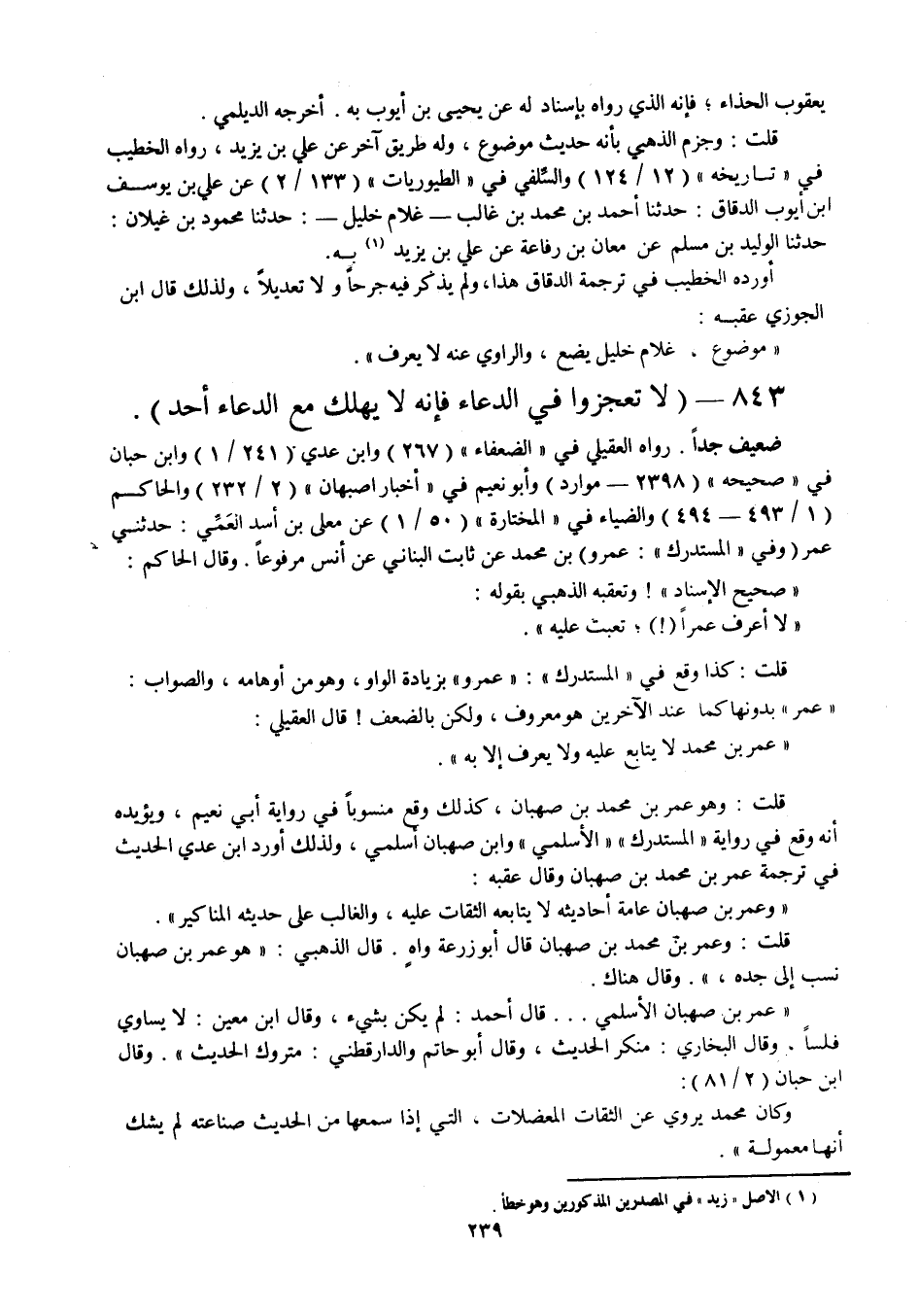قلت: وهو عمر بن محمد بن صهبان، كذلك وقع منسوبا في رواية أبي نعيم، ويؤيده أنه وقع في رواية " المستدرك " " الأسلمي " وابن صهبان أسلمي، ولذلك أورد ابن عدي الحديث في ترجمة عمر بن محمد بن صهبان وقال عقبه: " وعمر بن صهبان عامة أحاديثه لا يتابعه الثقات عليه، والغالب على حديثه المناكير ".