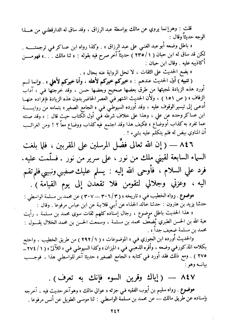 " باطل وضعه أبو عبد الغني على عبد الرزاق ". وكذا رواه ابن عساكر في ترجمته. لكن قد ساق له ابن حبان (1 / 235) حدثنا آخر صرح فيه بقوله: " حدثنا مالك ... " فهو من أكاذيبه عليه. وقال ابن حبان: يضع الحديث على الثقات، لا تحل الرواية عنه بحال ". (تنبيه) : أول الحديث عندهم: " خيركم خيركم لأهله، وأنا خيركم لأهلي ". وإنما لم أورد هذه الزيادة لمجيئها من طرق بعضها صحيح وبعضها حسن، وقد خرجتها في " آداب الزفاف " (ص 151) ، ولأن الحديث اشتهر في العصر الحاضر بدون هذه الزيادة فإفراده عنها أدعى إلى تيسير الوقوف عليه، وقد أورده السيوطي في " الجامع الصغير " بتمامه من رواية ابن عساكر وحده عن علي، وهذا على خلاف شرطه في أول الكتاب حيث قال: " وقد صنته عما تفرد به كذاب أو وضاع " فكيف هذا وقد اجتمع فيه كذاب ووضاع معا؟! ومن الغرائب أن المناوي بيض له فلم يتكلم عليه بشيء!