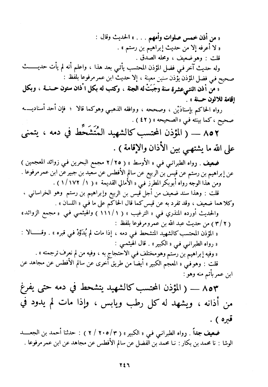 " من أذن خمس صلوات وأمهم ... " الحديث وقال: " لا أعرفه إلا من حديث إبراهيم بن رستم ". قلت: وهو ضعيف، ومحله الصدق وله حديث آخر في فضل المؤذن المحتسب يأتي بعد هذا، واعلم أنه لم يأت حديث صحيح في فضل المؤذن يؤذن سنين معينة، إلا حديث ابن عمر مرفوعا بلفظ: " من أذن اثنتي عشرة سنة وجبت له الجنة، وكتب له بكل أذان ستون حسنة، وبكل إقامة ثلاثون حسنة ". رواه الحاكم بإسنادين، وصححه، ووافقه الذهبي وهو كما قالا، فإن أحد إسناديه صحيح، كما بينته في " الصحيحة " (42) .
