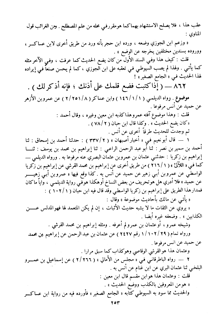 عقب هذا، فلا يصلح الاستشهاد بهما كما هو مقرر في محله من علم المصطلح. ومن الغرائب قول المناوي: " وزعم ابن الجوزي وضعه، ورده ابن حجر بأنه ورد من طريق أخرى لابن عساكر، ووروده بسندين مختلفين يخرجه عن الوضع ". قلت: كيف هذا وفي السند الأول من كان يضع الحديث كما عرفت، وفي الآخر مثله كما يأتي. ولهذا لم يصب السيوطي في تعقبه على ابن الجوزي، كما لم يحسن صنعا في إيراده لهذا الحديث في " الجامع الصغير "!
