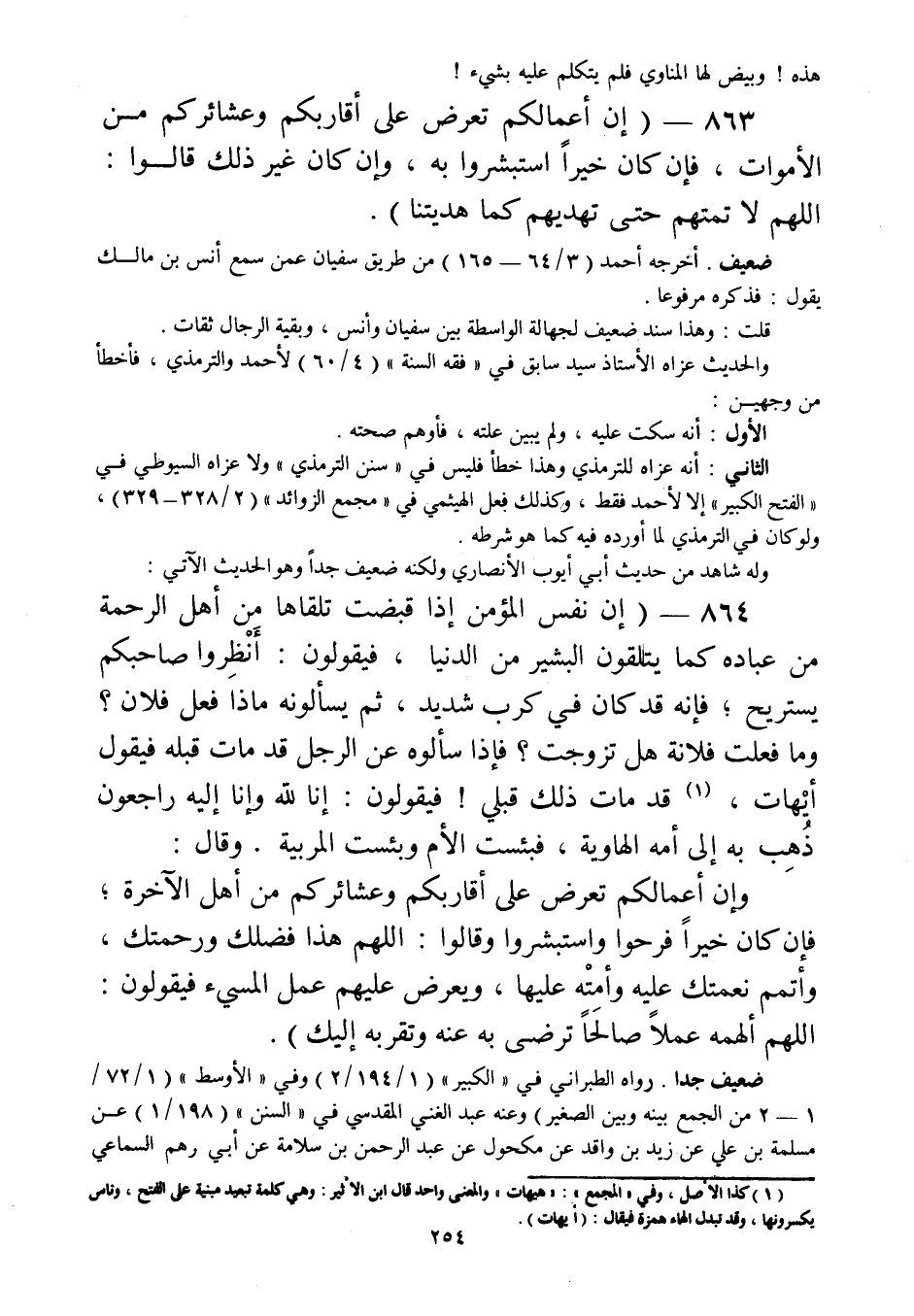 863 - " إن أعمالكم تعرض على أقاربكم وعشائركم من الأموات، فإن كان خيرا استبشروا به، وإن كان غير ذلك قالوا: اللهم لا تمتهم حتى تهديهم كما هديتنا ".