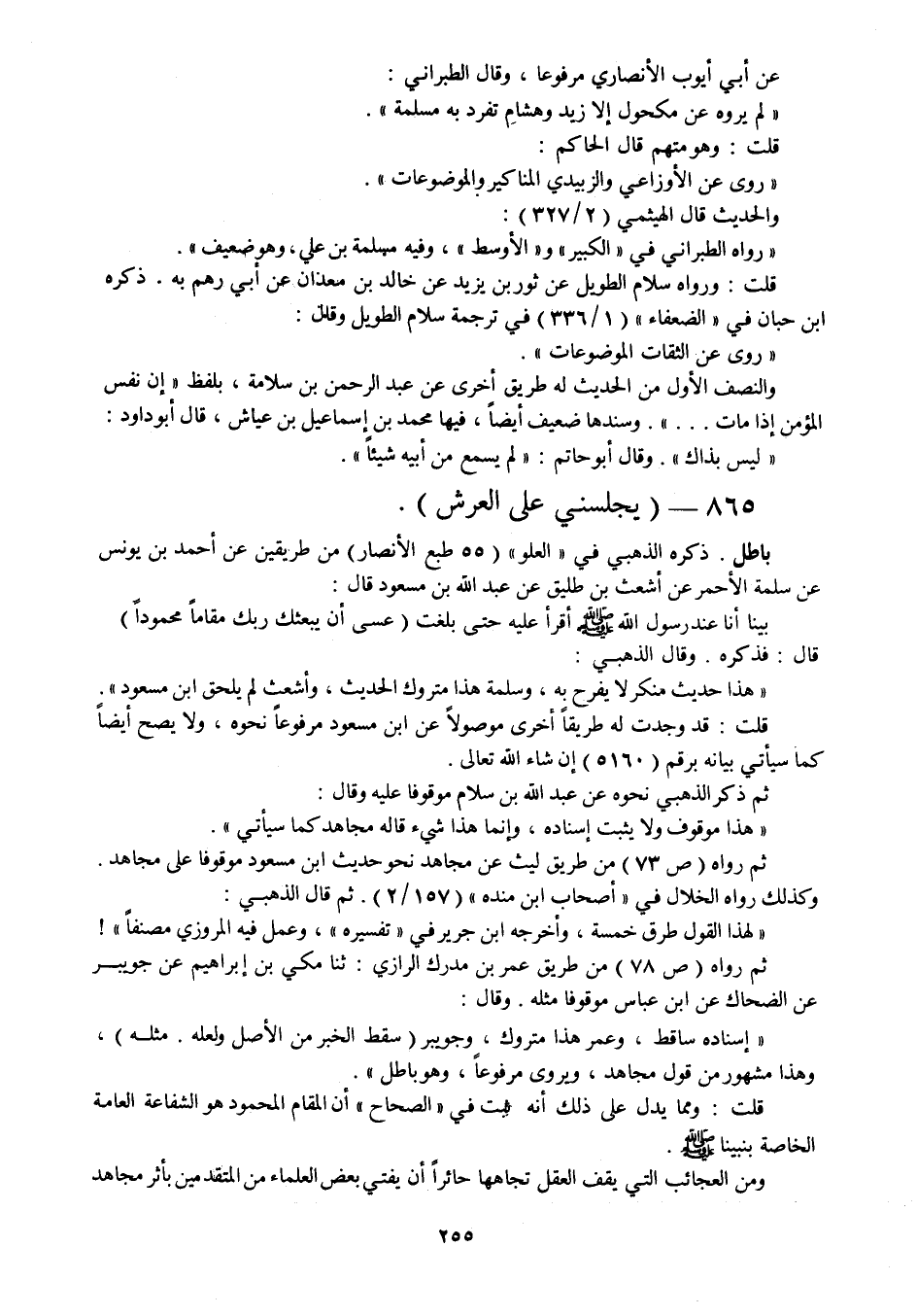 قلت: ومما يدل على ذلك أنه ثبت في " الصحاح " أن المقام المحمود هو الشفاعة العامة الخاصة بنبينا صلى الله عليه وسلم. ومن العجائب التي يقف العقل تجاهها حائرا أن يفتي بعض العلماء من المتقدمين بأثر مجاهد