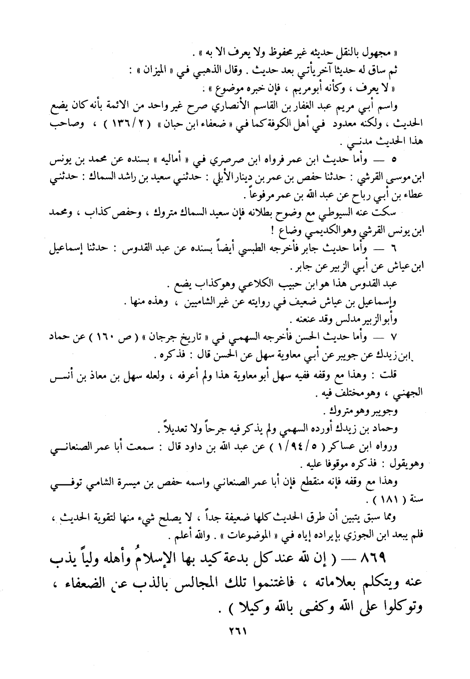 869 - " إن لله عند كل بدعة كيد بها الإسلام وأهله وليا يذب عنه ويتكلم بعلاماته، فاغتنموا تلك المجالس بالذب عن الضعفاء، وتوكلوا على الله وكفى بالله وكيلا ".