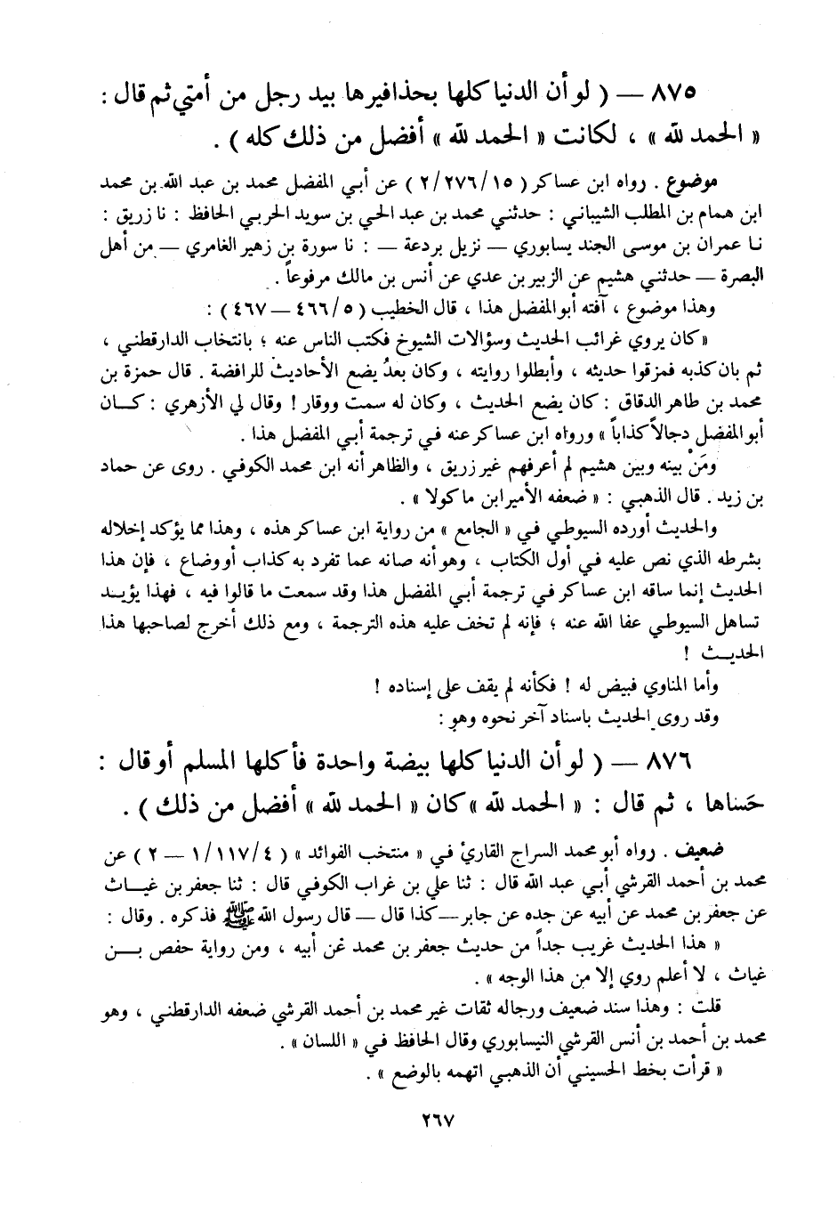 875 - " لوأن الدنيا كلها بحذافيرها بيد رجل من أمتي ثم قال: الحمد لله، لكانت الحمد لله أفضل من ذلك كله ".